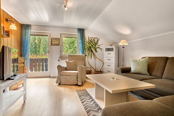 - großes Wohnzimmer mit Balkon, Sat-TV Flachbildschirm, Sitzgruppe, Leseecke