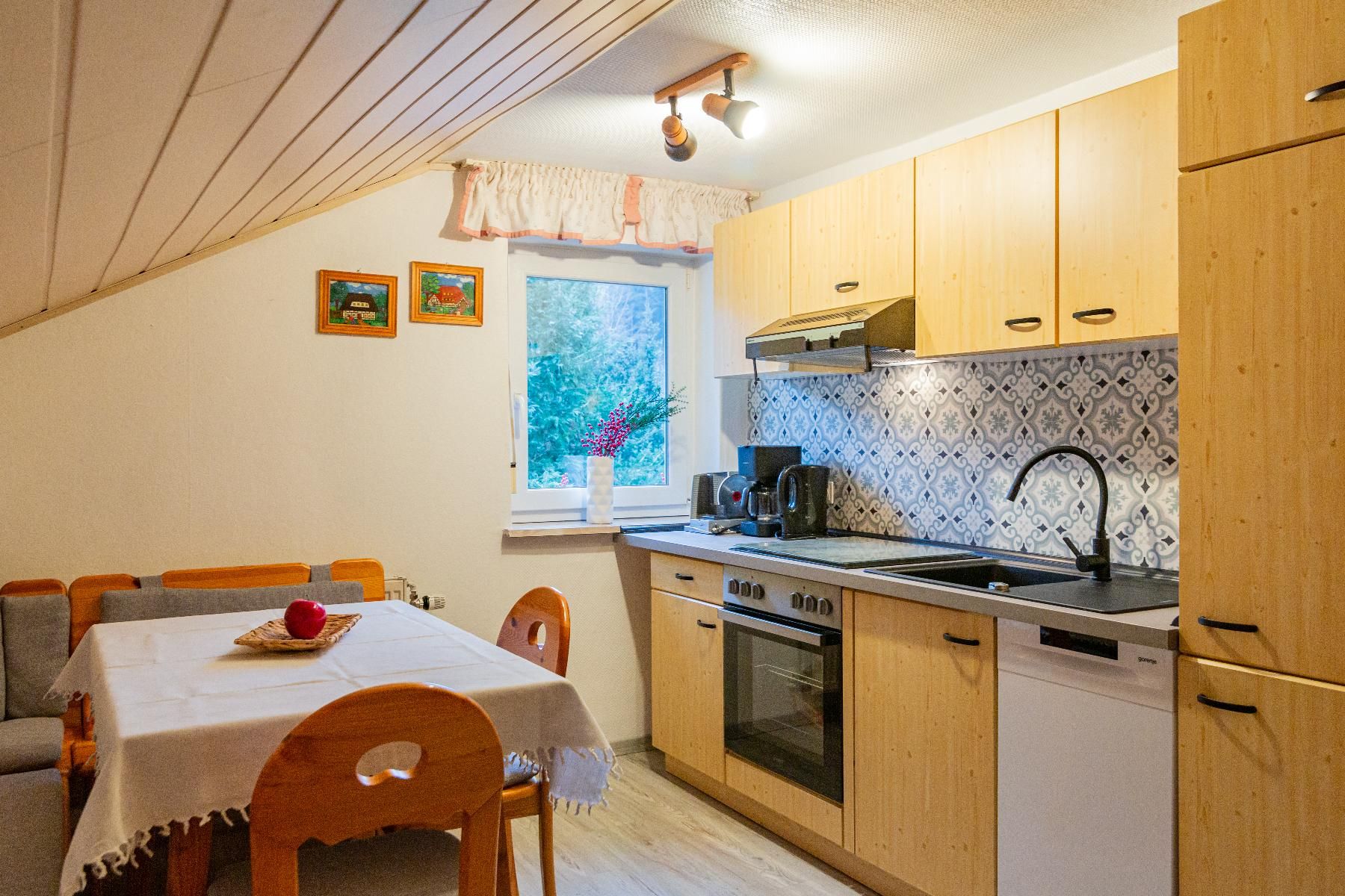 - Küche mit Essplatz, E-Herd, Kaffeemaschine, Wasserkocher, Mikrowelle, Allesschneider, großer Kühlschrank