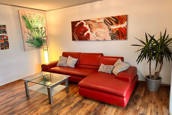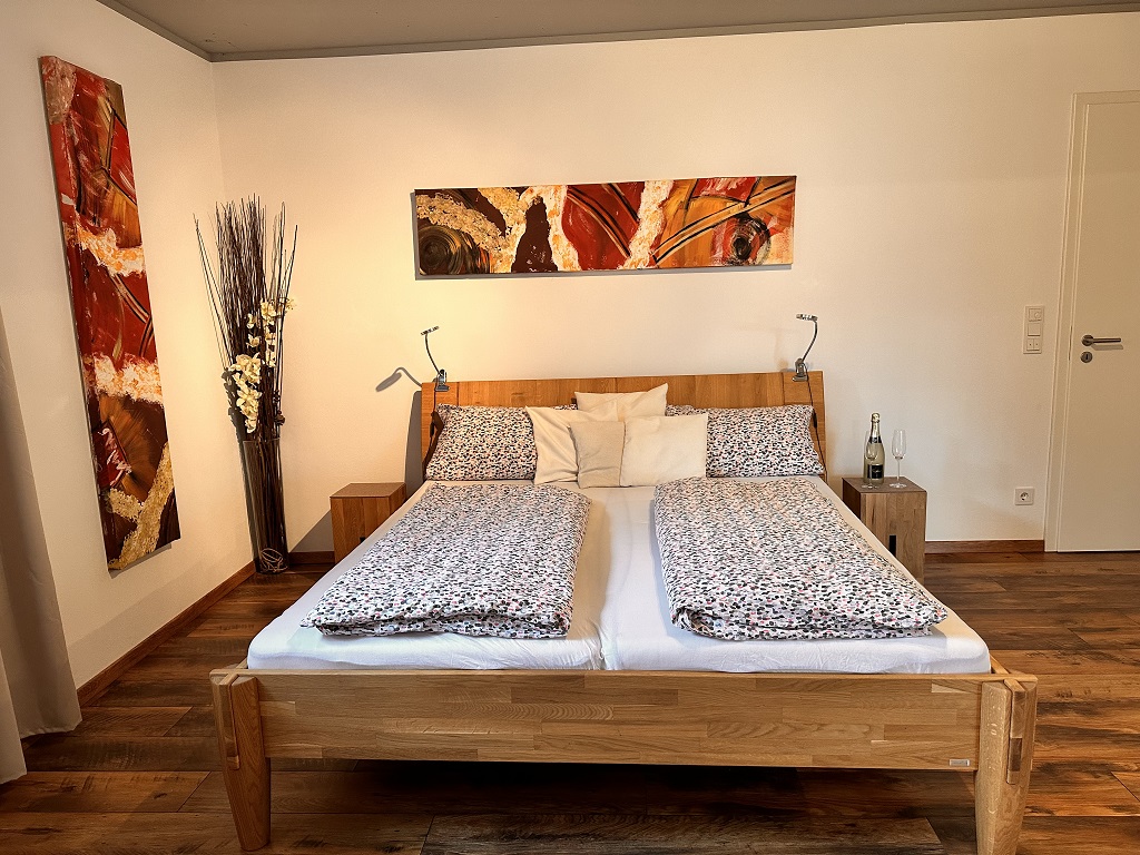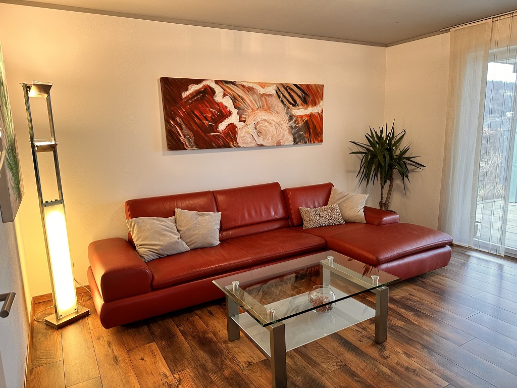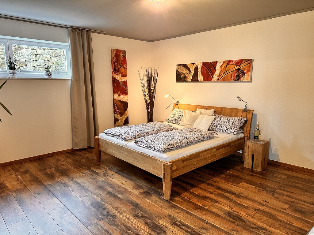 Die neu eingerichtete, harmonisch aufeinander abgestimmte Ferienwohnung, auf der Südseite im Untergeschoss unseres Hanghauses mit separatem Eingang ist 72 m² groß und verfügt über eine Küche mit Essbereich ein Wohnzimmer ein großzügiges Schlafzimmer ein Bad sowie ein separates WC. Die 35 qm großen Südterrasse ist überdacht.