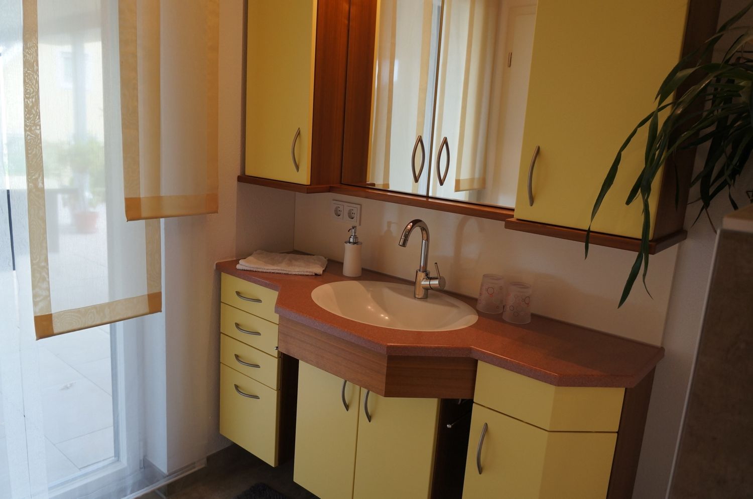 Das Bad ist ausgestattet mit einem großzügigen Waschtisch mit Unterschränken und beleuchtetem Spiegelschrank. Ein Fön und Handtücher. Eine bodenebene Dusche und ein WC. Zusätzlich bietet die Wohnung ein seperates WC mit Waschbecken und Spiegel.