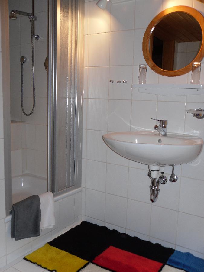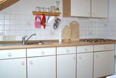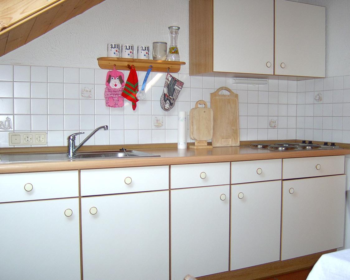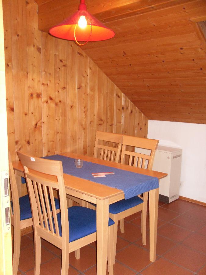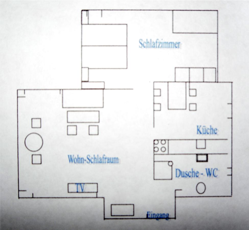 Wohnküche: Sitzecke mit Tisch und 4 Stühlen, Kochmulde mit 4 Platten, Kühlschrank mit Gefrierfach, Kaffeemaschine, Wasserkocher, Toaster, ausreichend Geschirr und Gläser, Geschirr- und Spültücher, Staubsauger.