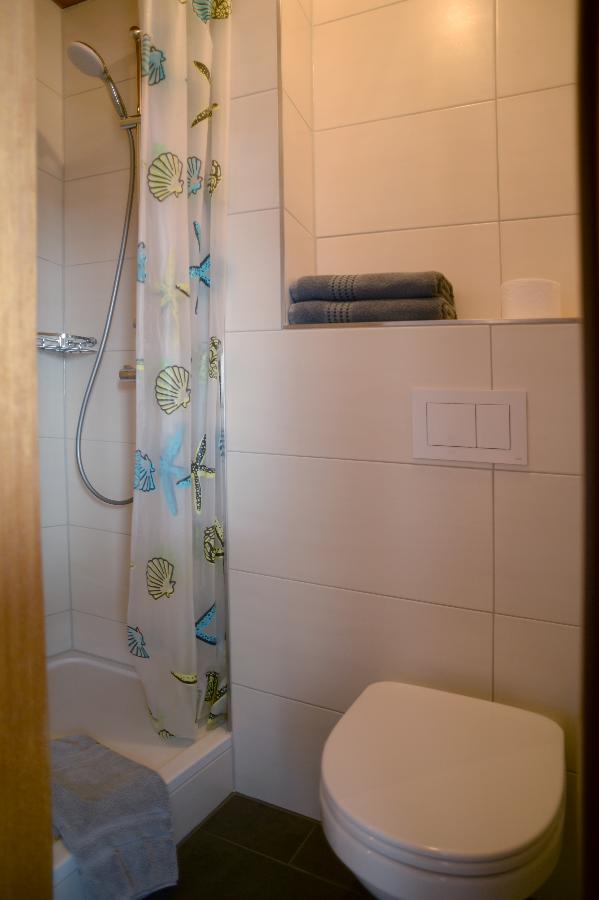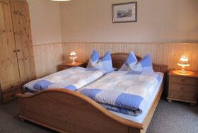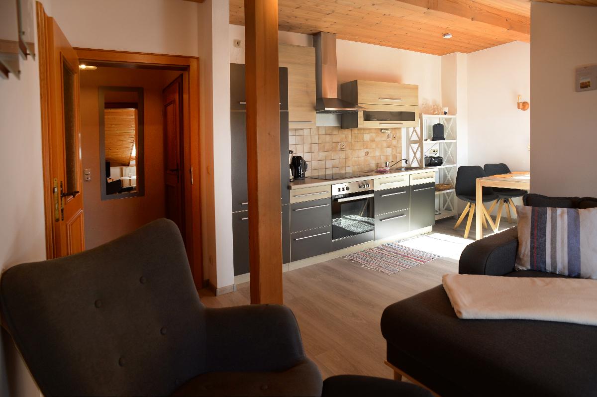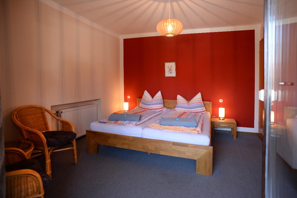 Die Ferienwohnung 1 befindet sich im 1. Stock des Hauses. Die Wohnung verfügt über ein Schlafzimmer mit Doppelbett, einem kleinen Bad mit Dusche/WC, einen Wohnraum mit Esstisch und einer kleinen Küche (kein Backofen vorhanden, aber eine Mikrowelle) und einen Flur. Ebenfalls sind Balkone nach Süd und Nord zur Benutzung.