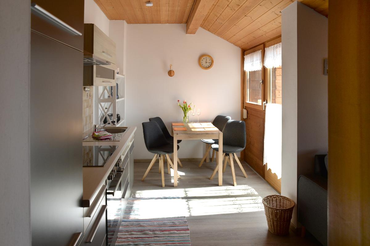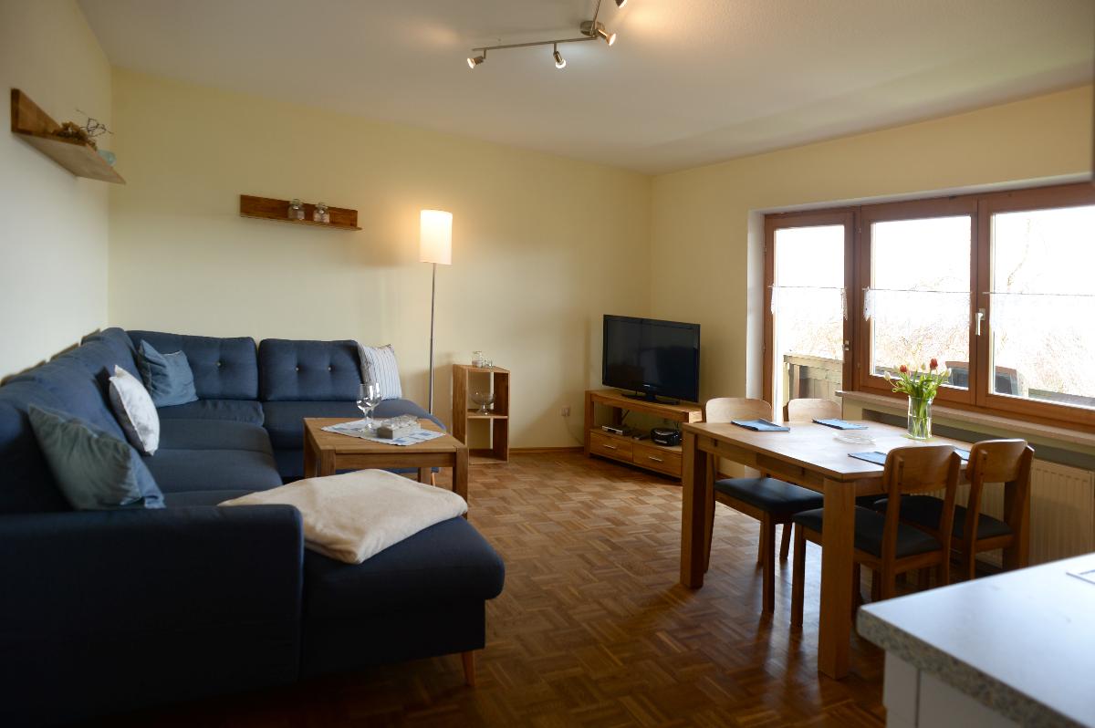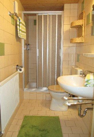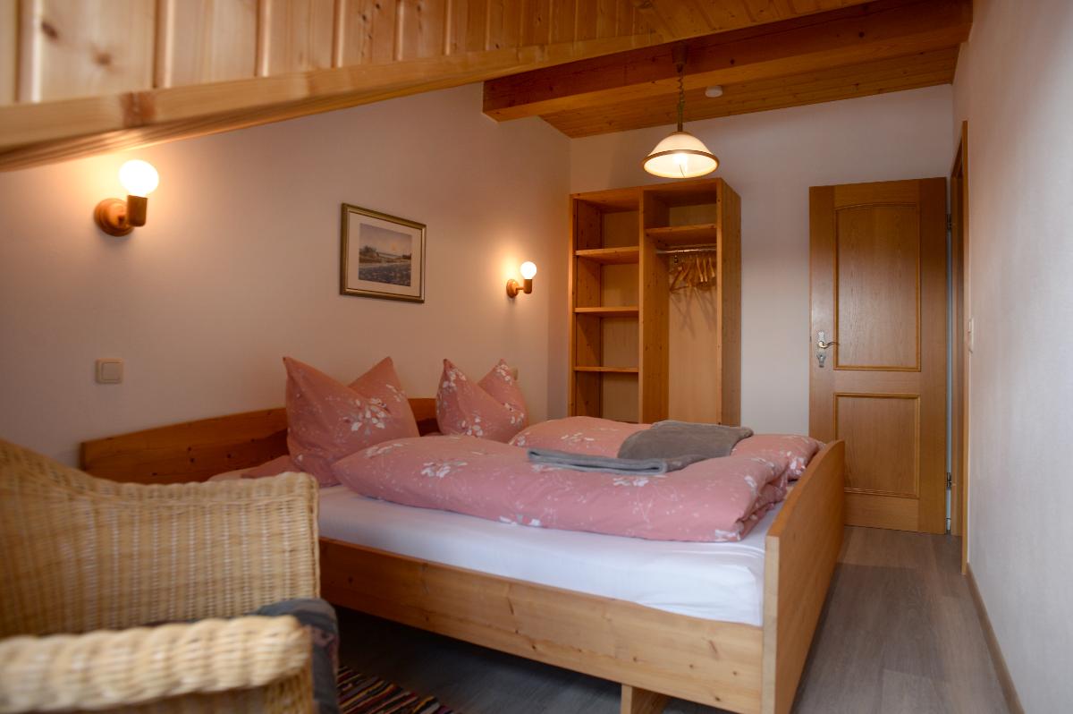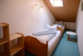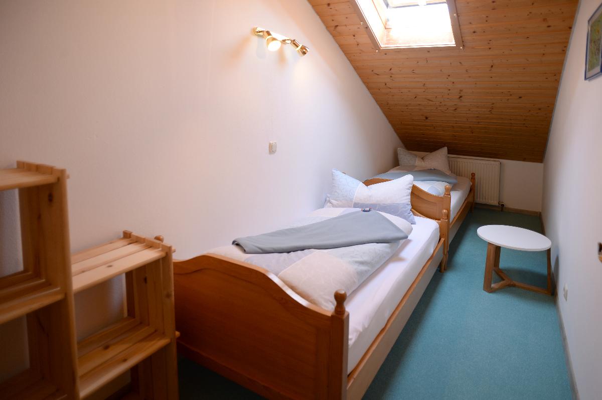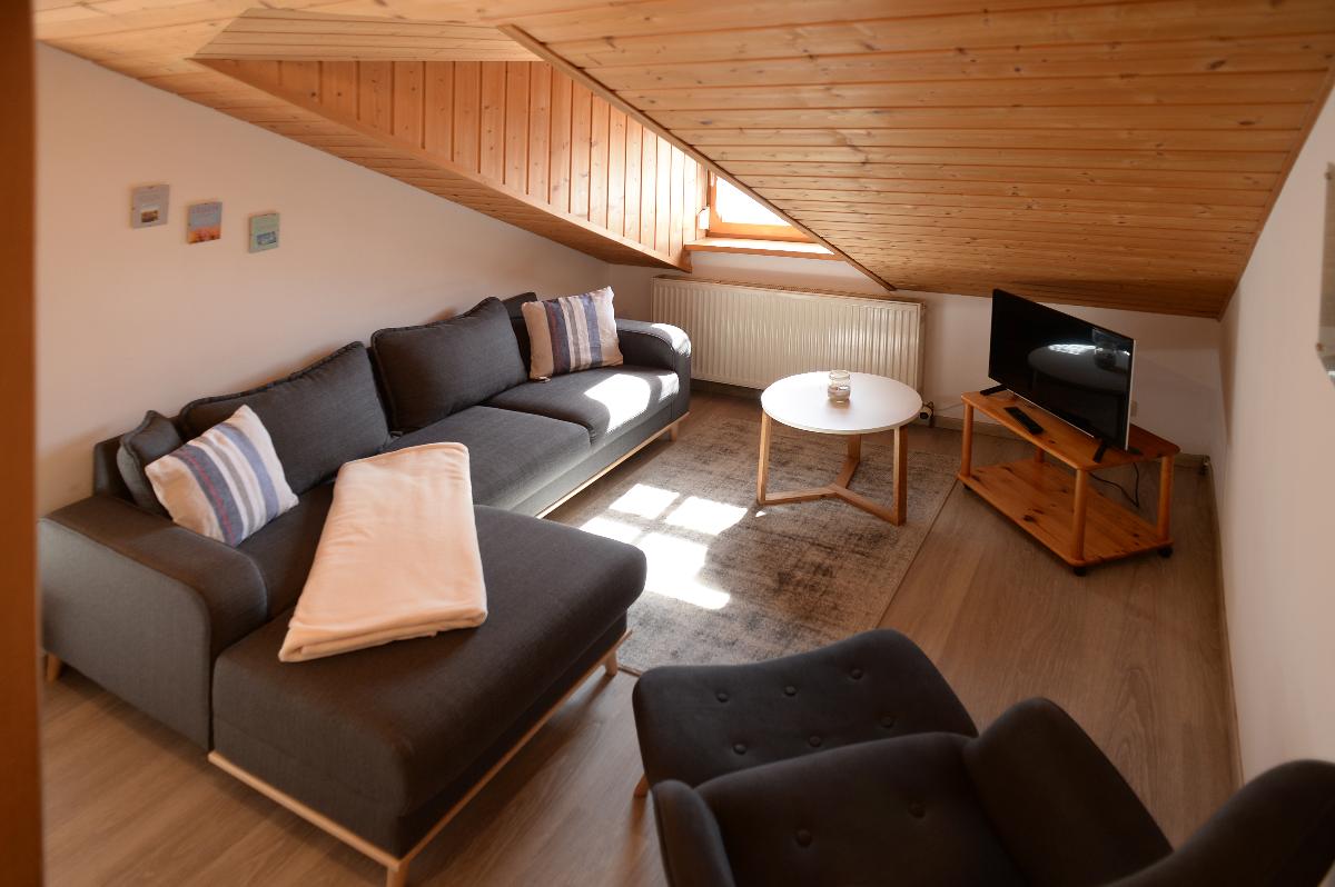 Die Ferienwohnung 4 befindet sich im 2. Stock des Hauses und ist eine gemütliche Mansardenwohnung mit Dachgauben. Die Wohnung verfügt über ein Schlafzimmer mit Doppelbett und Einzelbett, einen Wohnraum mit Esstisch und Küchenzeile (Zugang zu einer verglasten Dachterrasse mit Sitzmöglichkeit), ein Bad mit Wanne/WC und einen Flur.