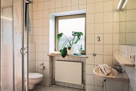 des Badezimmer mit Waschgelegenheit, Dusche, WC und Fön erhellt die
