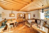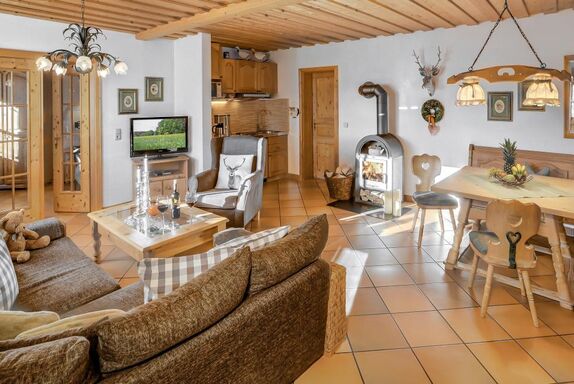 70m² große Parterre-Wohnung Riederin bestehend aus Vorflur, Wohnzimmer mit Sat-TV, zusätzlichem Kaminofen, Küchenzeile, separatem Schlafzimmer mit Erker, 2. Fernseher im Schlafzimmer vorhanden