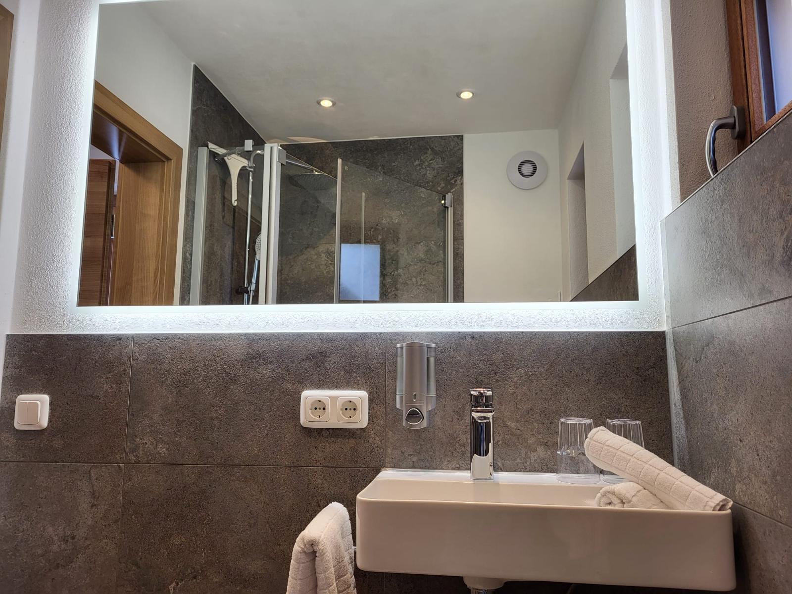 Dusche und WC ist mit Kosmetikspiegel, Haarfön, Hand- und Duschtücher, Shampoo