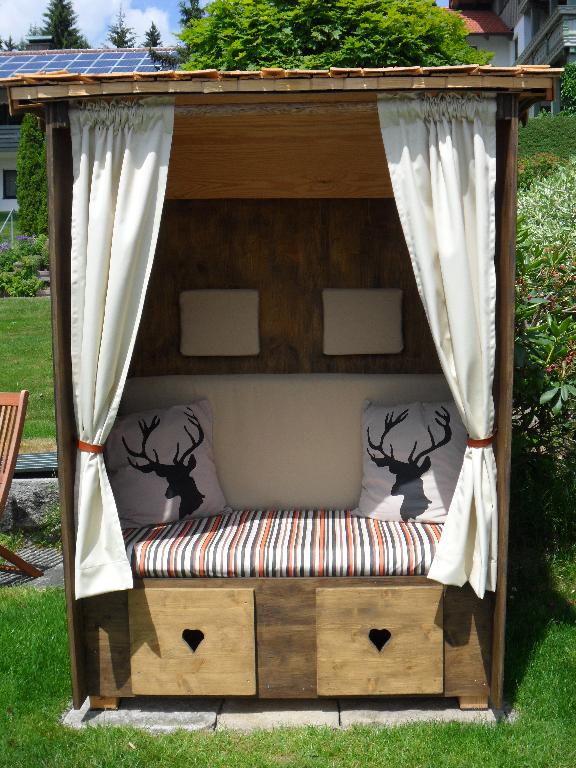 Im stimmungsvollen Garten mit Bayerwald-Strandkorb, Tisch, Stühlen und