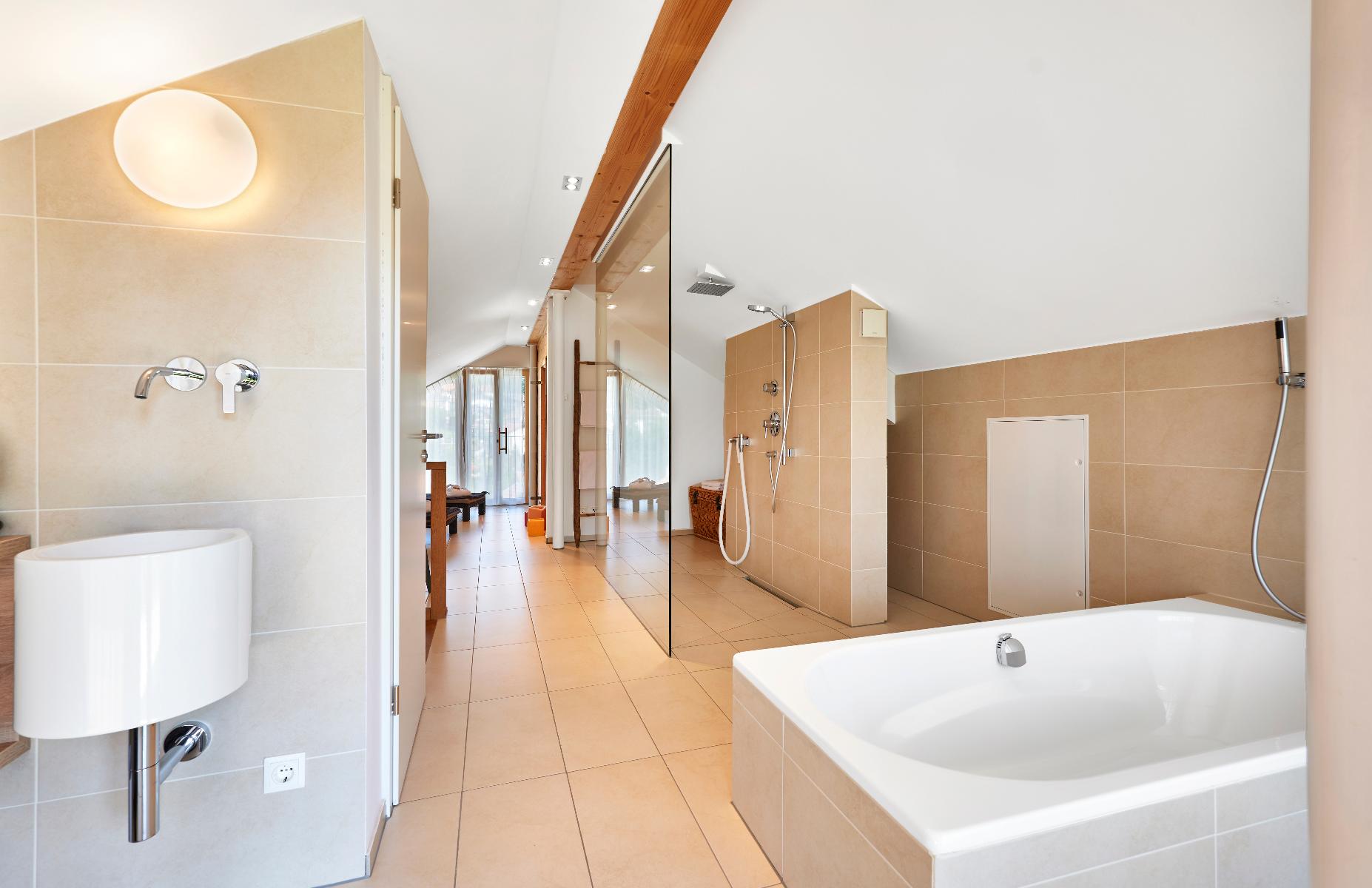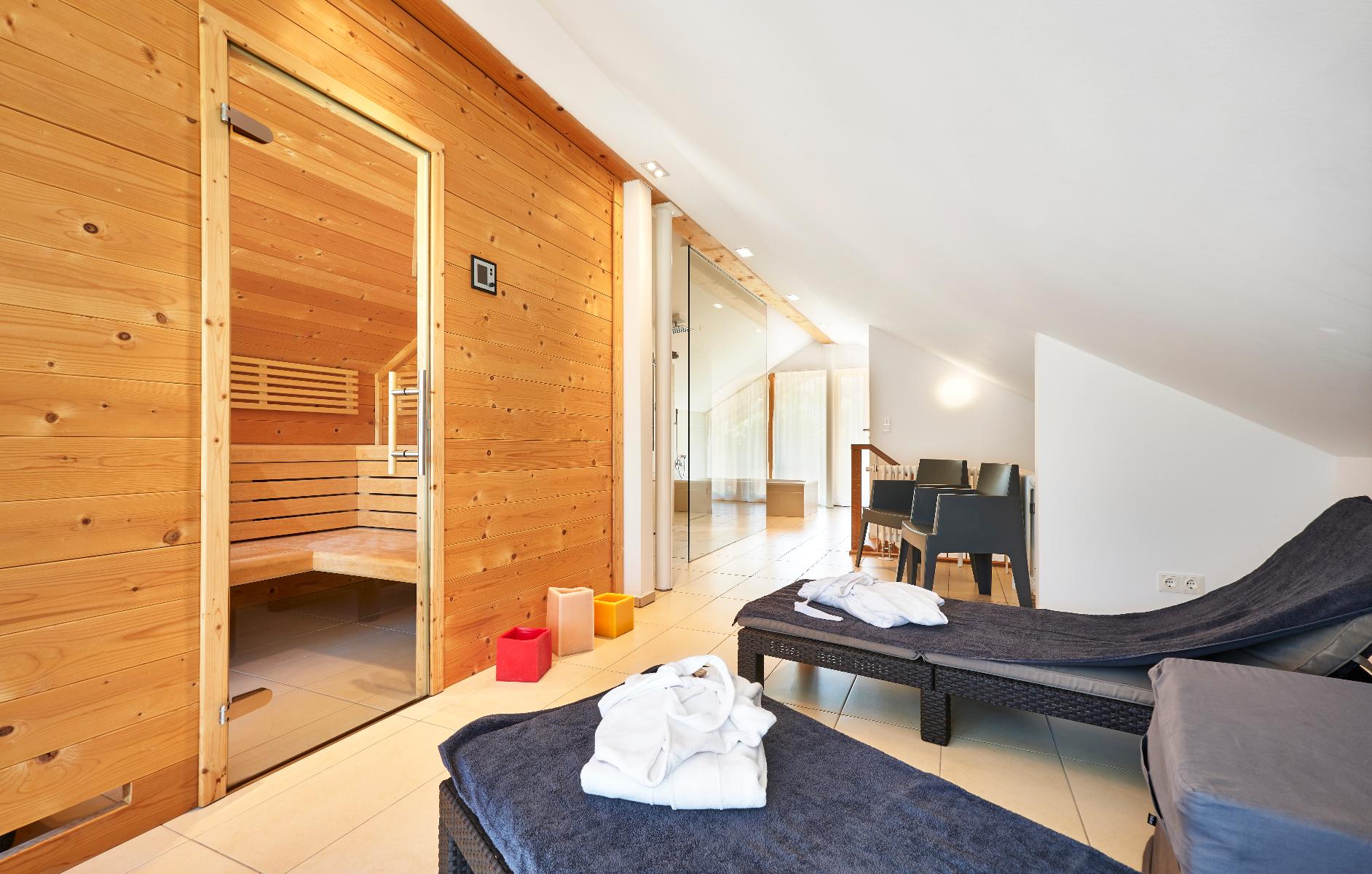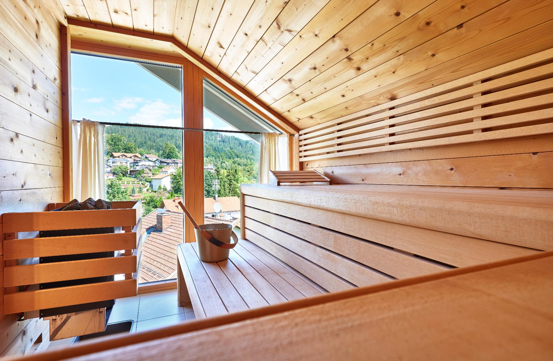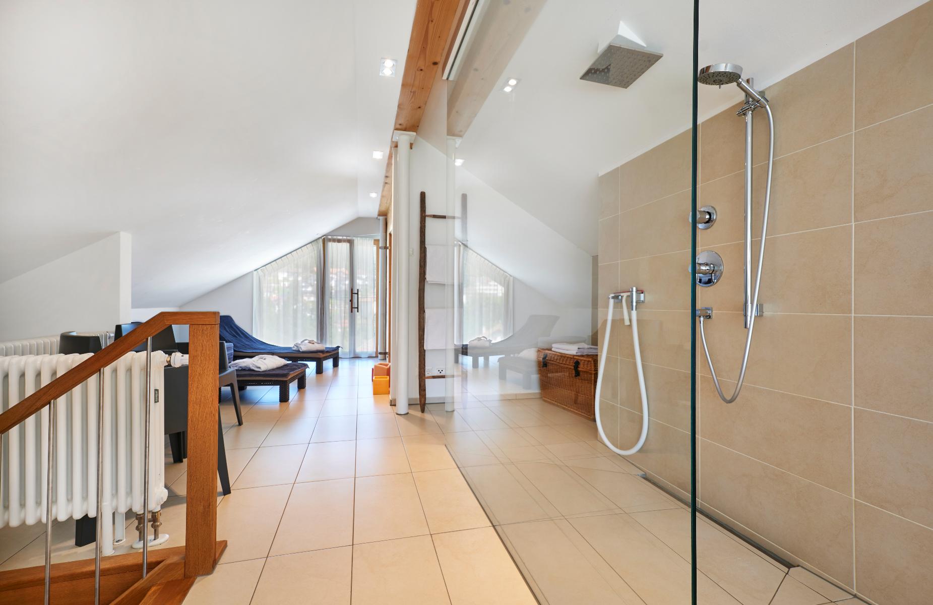 Im Dachgeschoss befindet sich die Sauna mit Blick auf den Großen Arber, die walk-in Dusche und die Badewanne. Daneben noch ein WC und viel Platz zum Entspannen und Genießen der Aussicht.