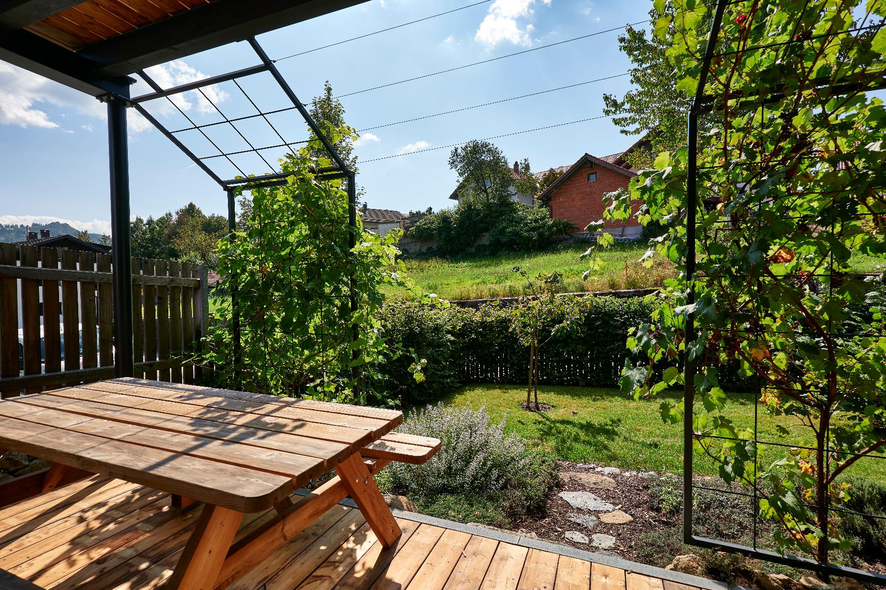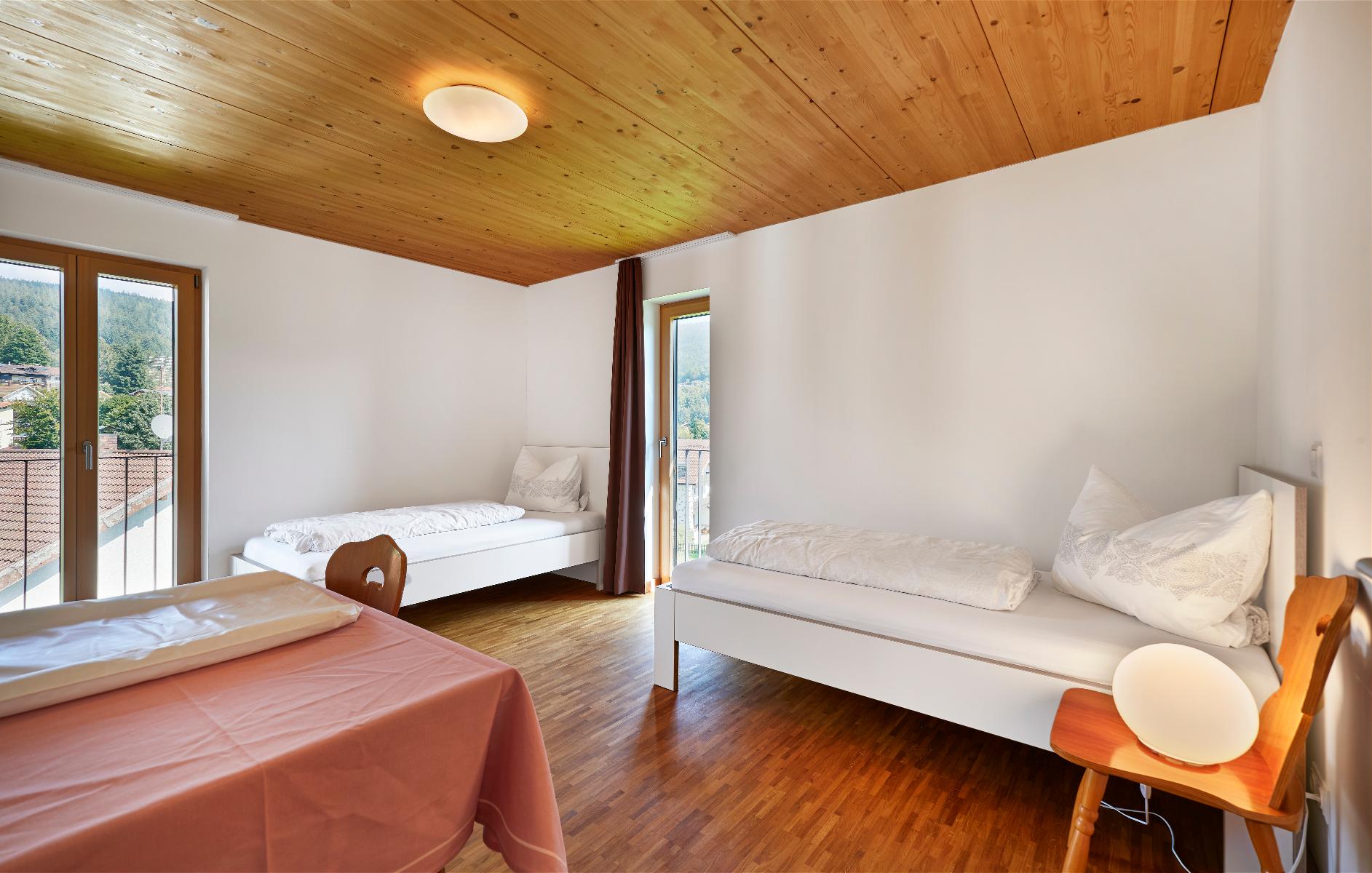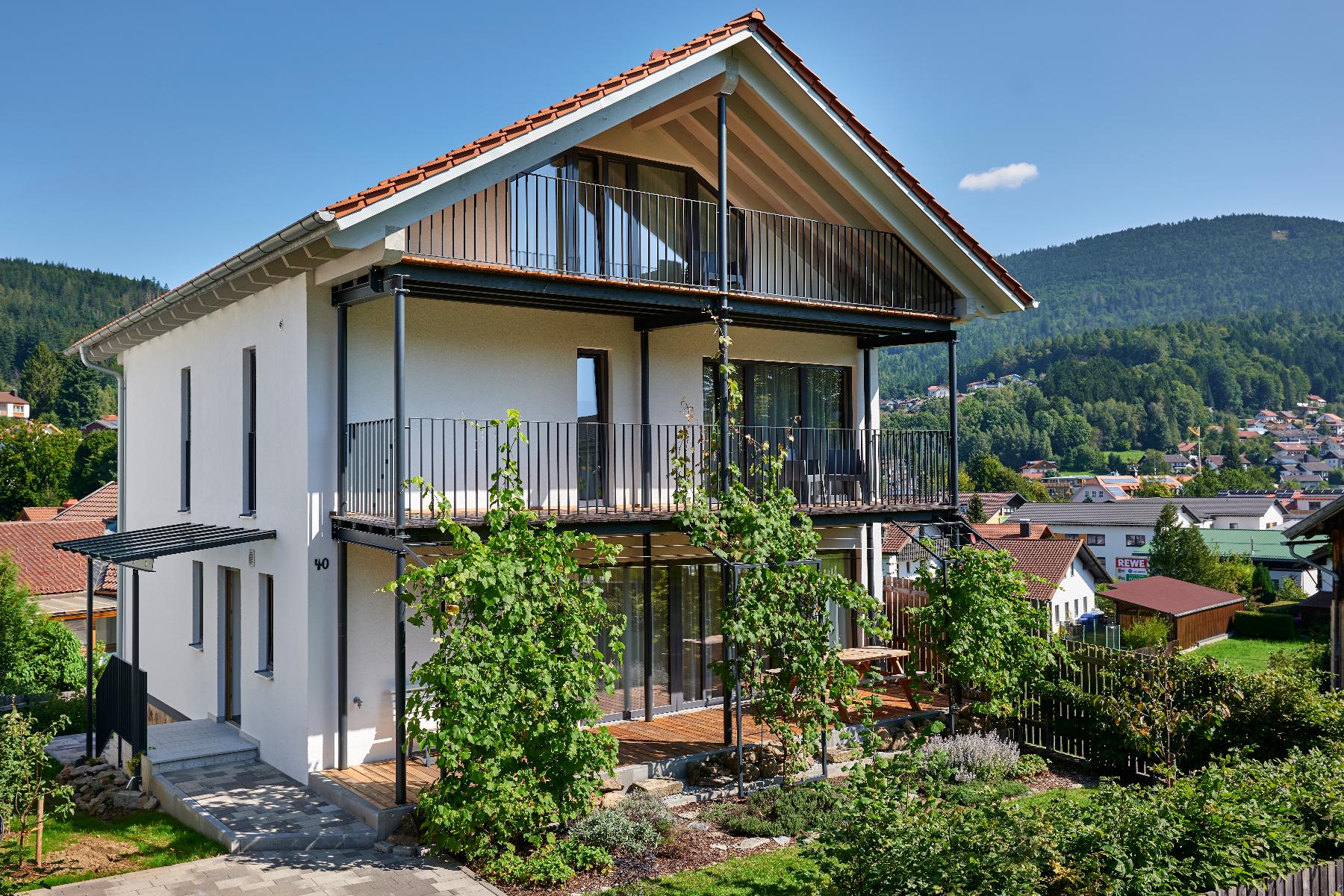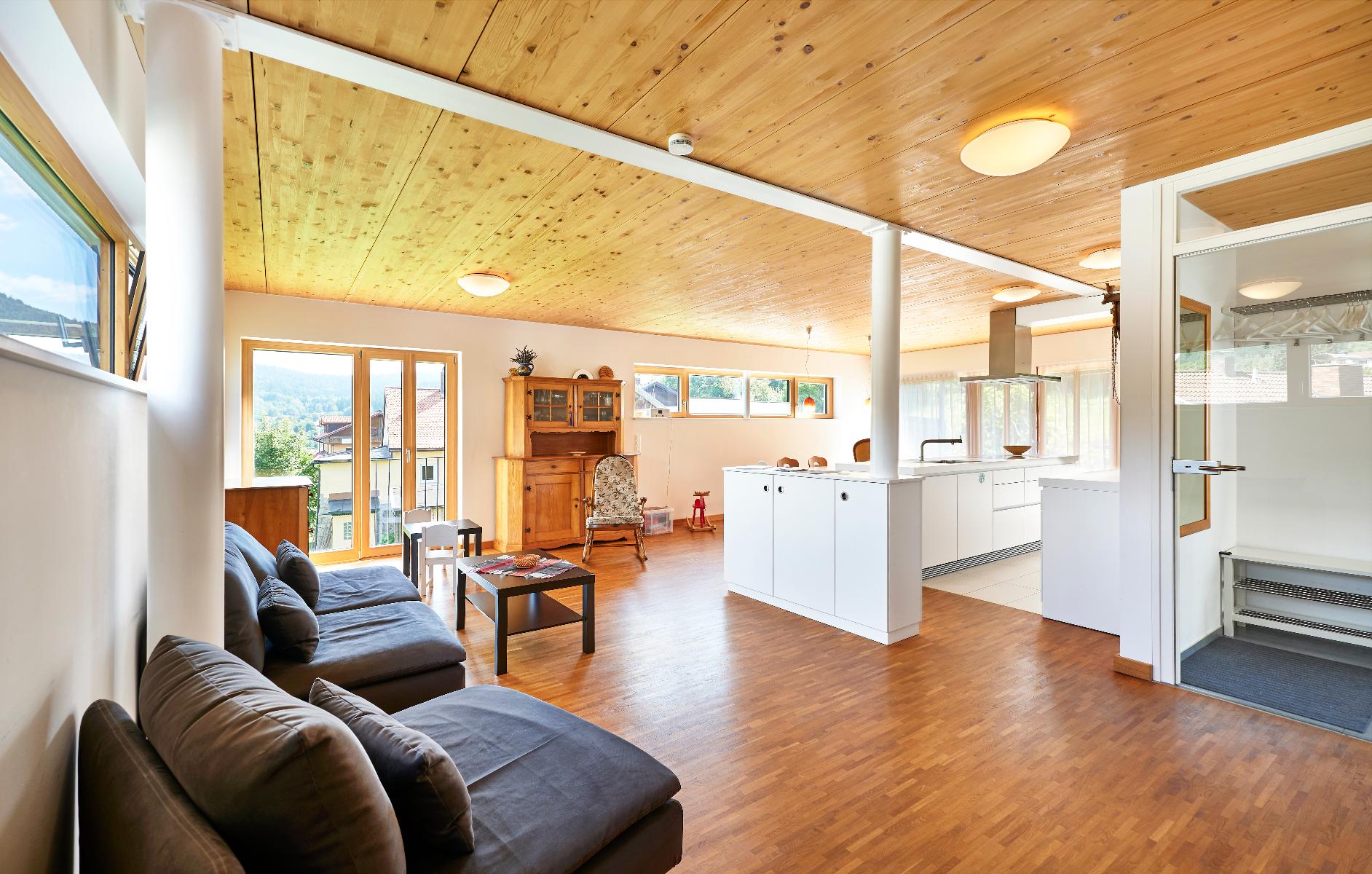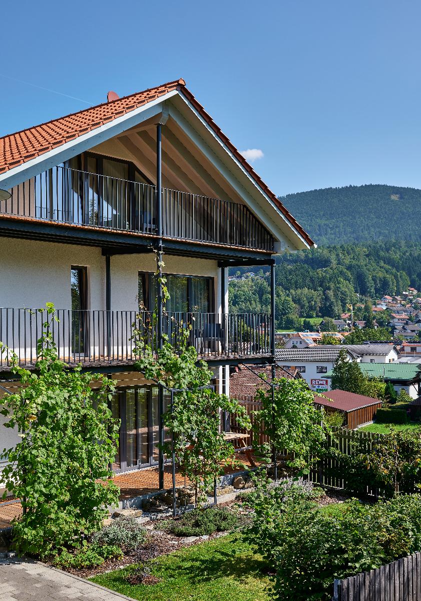 Das Erdgeschoss besteht aus einem großen Wohn- und Essraum und einer offenen Küche mit Kochinsel der Firma Bulthaup. Im Obergeschoss befinden sich die 3 Schlafzimmer für insgesamt 6 Personen und ein Badezimmer. Im Dachgeschoss befindet sich die Sauna mit Blick auf den Großen Arber, die walk in Dusche und die Badewanne. Daneben noch ein WC und viel Platz zum Entspannen und Genießen der Aussicht.