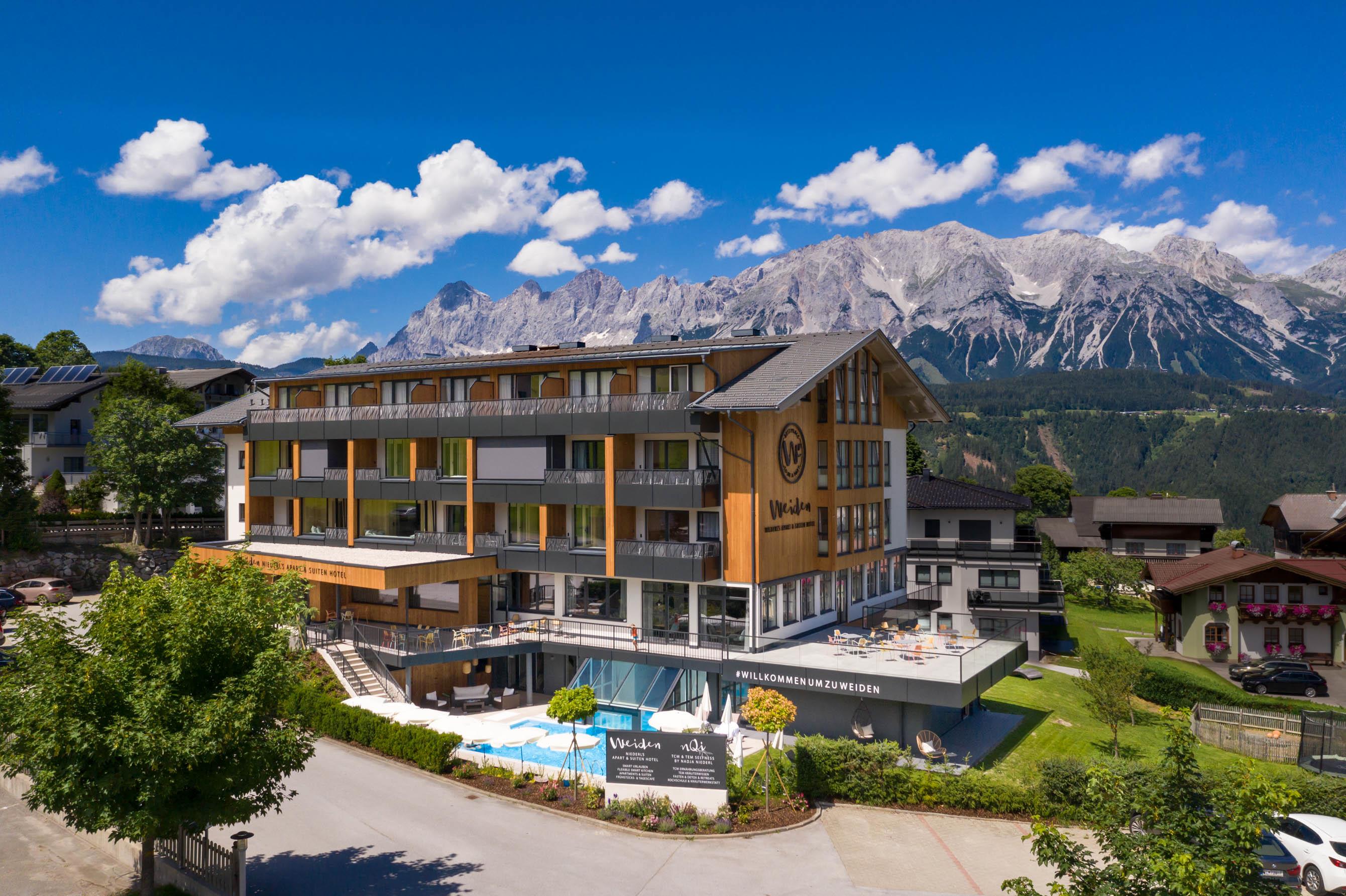 Das Hotel WEIDEN mit Wohnzimmerfeeling und innovativem Konzept hat erstklassige Lage am Hochplateau Rohrmoos oberhalb von Schladming. Im Skiurlaub direkt neben der Skipiste, im Sommerurlaub mitten in der Wanderregion Schladming Dachstein.