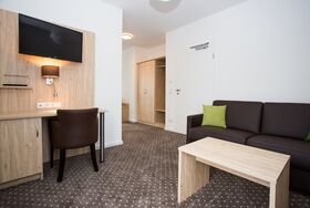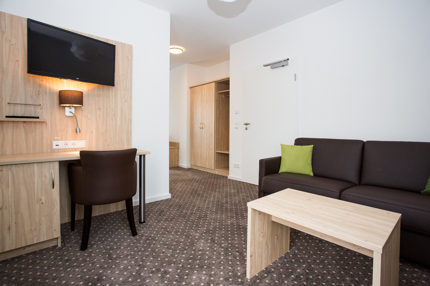Das Doppelzimmer Komfort ist ausgestattet mit Dusche/ WC, Fön, SAT-TV, Zimmersafe, Kühlschrank, kostenlosem W-LAN, Telefon und Balkon sowie mit einem gemütlichen Wohnbereich mit Couch.