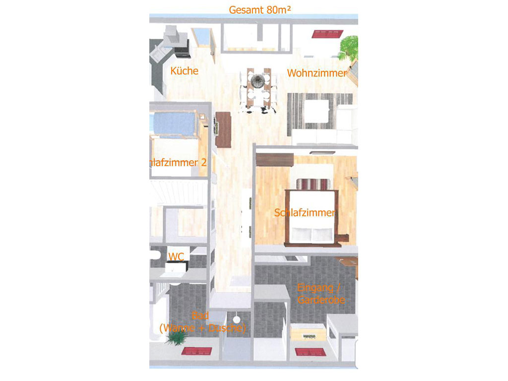 Es erwartet Sie eine großzügige, völlig neu renovierte Wohnung mit zwei Schlafzimmern, Küche, einem großzügigen Bad mit begehbarer Dusche und Badewanne sowie ein geräumiges Wohnzimmer mit Essecke. Die 80 m² große Wohnung befindet sich im Gartengeschoss und hat direkten Zugang zu den Terrassen.