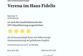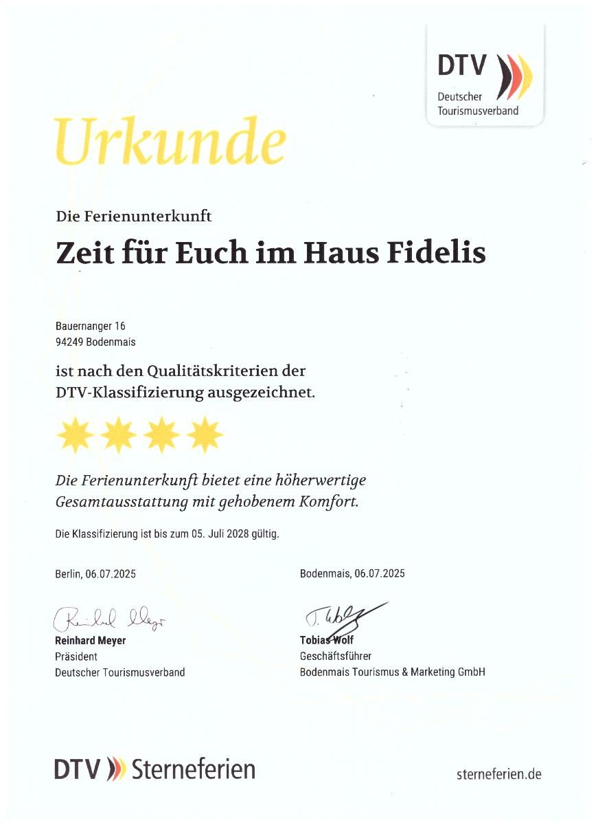 verfügt ebenso wie die anderen Wohnungen über eine 4****Sterne Ausstattung. Die erneute Klassifizierung mit 4****Sternen fand durch die DTV im Juli 2025 statt. Ebenso hat unsere kleinste Ferienwohnung Zeit für Euch wiederholt 4 Sterne ergattert. Hier können Sie Ihren Urlaub für 2 Personen, in Holzmassivbauweise verbringen. Das Haus wurde 2018 neu erbaut und im Erdgeschoß haben wir eine barrierefreie Ferienwohnung mit eigener Terrasse eingerichtet.