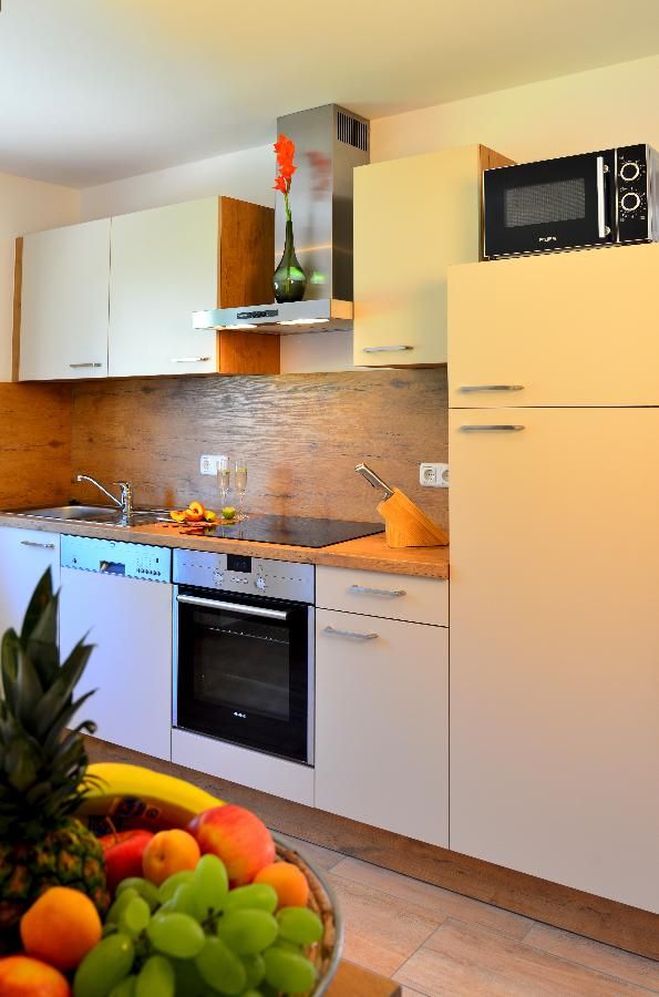 Unsere modernen und großzügigen 4****Sterne Ferienwohnungen Sebastian und Fidelis im Erdgeschoss bzw. Parterre verfügen unter anderem über eine gemütliche Küche mit Spülmaschine, Mikrowelle, Eierkocher, Wasserkocher, Kaffeemaschine/Padmaschine und Toaster, ein neues Bad und eine neue, moderne Einrichtung. Die Wohnungen 1 und 2 im Obergeschoss wurden von März bis Juni 2017 zu einer geräumigen 95qm Wohnung für bis zu 6 Personen umgebaut. Ferienwohnung Verena