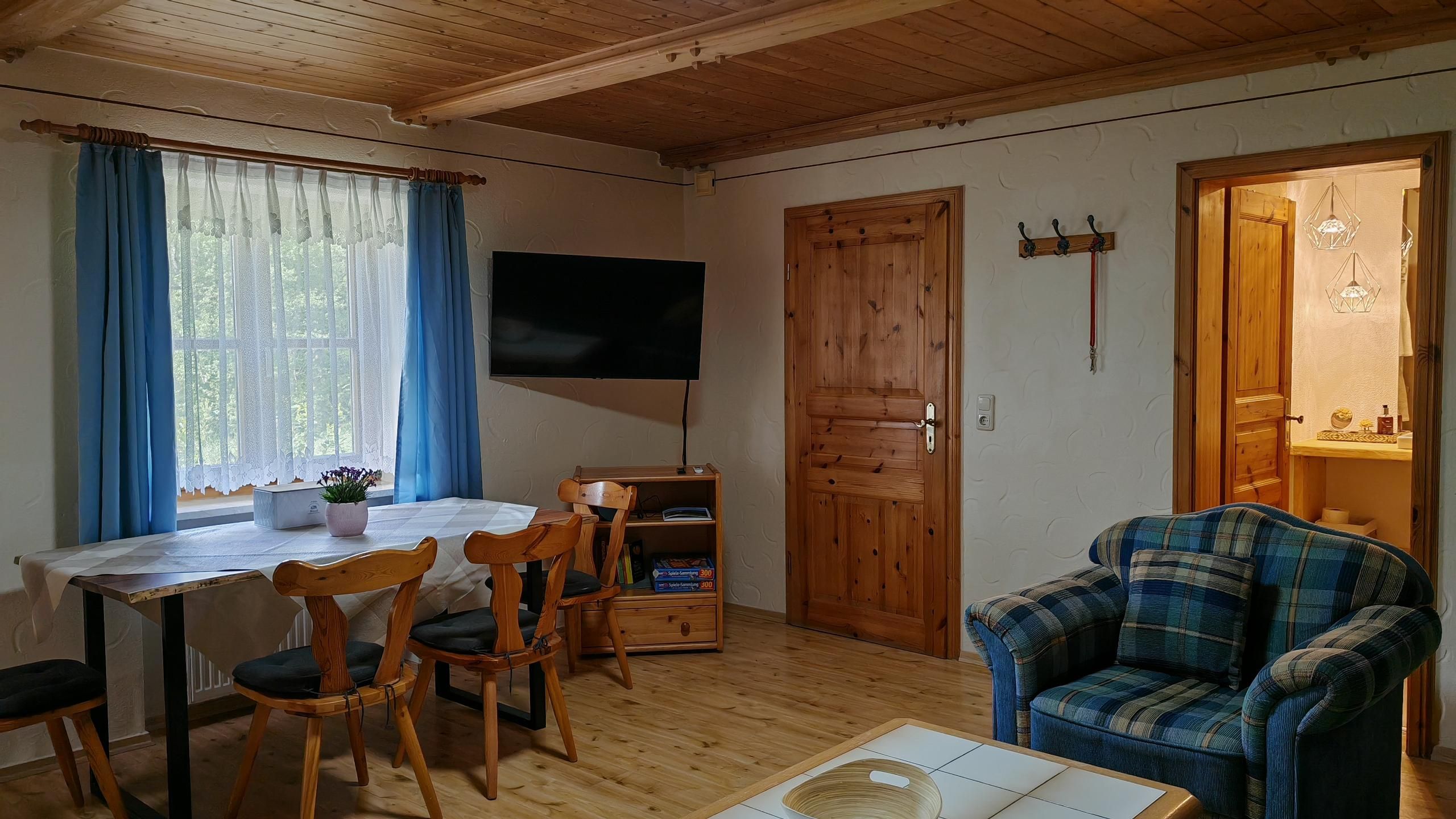 Die Ferienwohnung Blumenwiese ist ca. 60qm groß und für 4 Personen ausgelegt. Sie befindet sich im Erdgeschoss. Im schönen Schlafzimmer steht ein bequemes Doppelbett. Die große Schlafcouch im Wohnzimmer bietet Platz für zwei weitere Personen. Das Wohnzimmer mit Couch, SAT-TV, Radio, Telefon und Tisch lädt zum Verweilen ein. Die Küche mit Backofen, Herd, Kühlschrank, Toaster, Kaffeemaschine und Esstisch lässt keine Wünsche offen. Das Bad besteht aus Dusche und WC. Auf der schönen Terrasse können Sie die Sonne und Aussicht genießen.