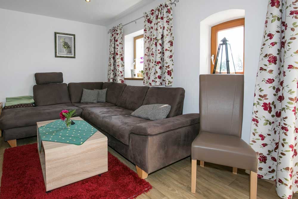 Die Ferienwohnung Silberberg ist 75 qm groß und verfügt über 2 Schlafzimmer mit jeweils einem bequemen Doppelbett und Flachbild-TV. Das geräumige Wohnzimmer mit Sat-TV, großer Couch und Kachelofen lädt zum Verweilen ein. Die behindertengerechte, moderne Küche mit Spülmaschine, Mikrowelle, Toaster, Wasserkocher, Espressomaschine lässt keine Wünsche offen. Das Bad besteht aus ebenerdiger Regendusche, Whirlpoolbadewanne und WC. Auf dem schönen Balkon und der großen Terrasse können Sie die Sonne und Aussicht genießen. Die Barrierefreiheit wurde geprüft von Reisen für Alle. Babygerechte Ausstattung möglich. Frühstücksbuffet gegen Aufpreis möglich. Tischtennisraum mit großem Fußballkicker, große Liegewiese mit Liegen und Grill und ein separater Waschraum mit Waschmaschine und Trockner stehen unseren Gästen zur Verfügung. Kostenloses Reiten am Hof und auf Wunsch Kinderbetreuung. Separates Kinderspielzimmer, Aufenthaltsraum, eigener schattiger Kinderspielplatz mit Baumhaus, großem Trampolin und Lagerfeuerstelle.