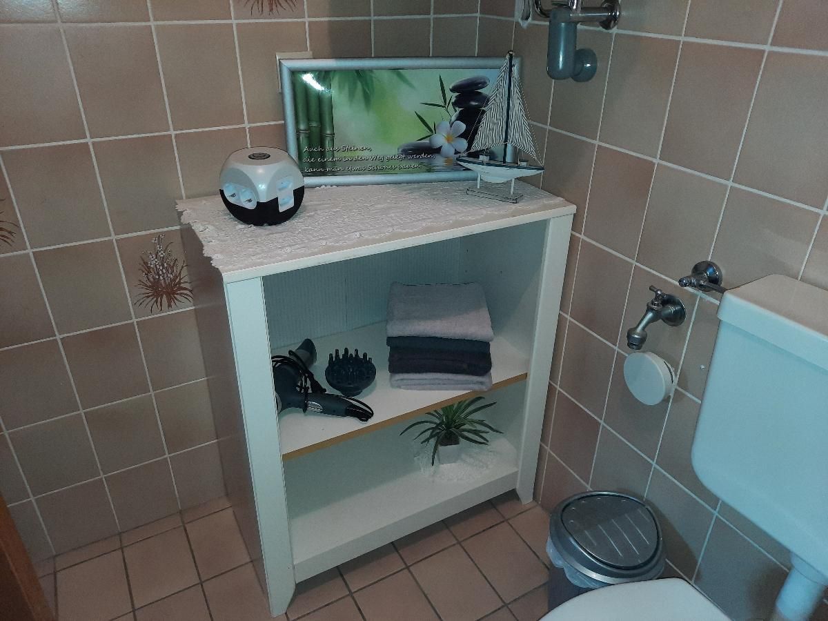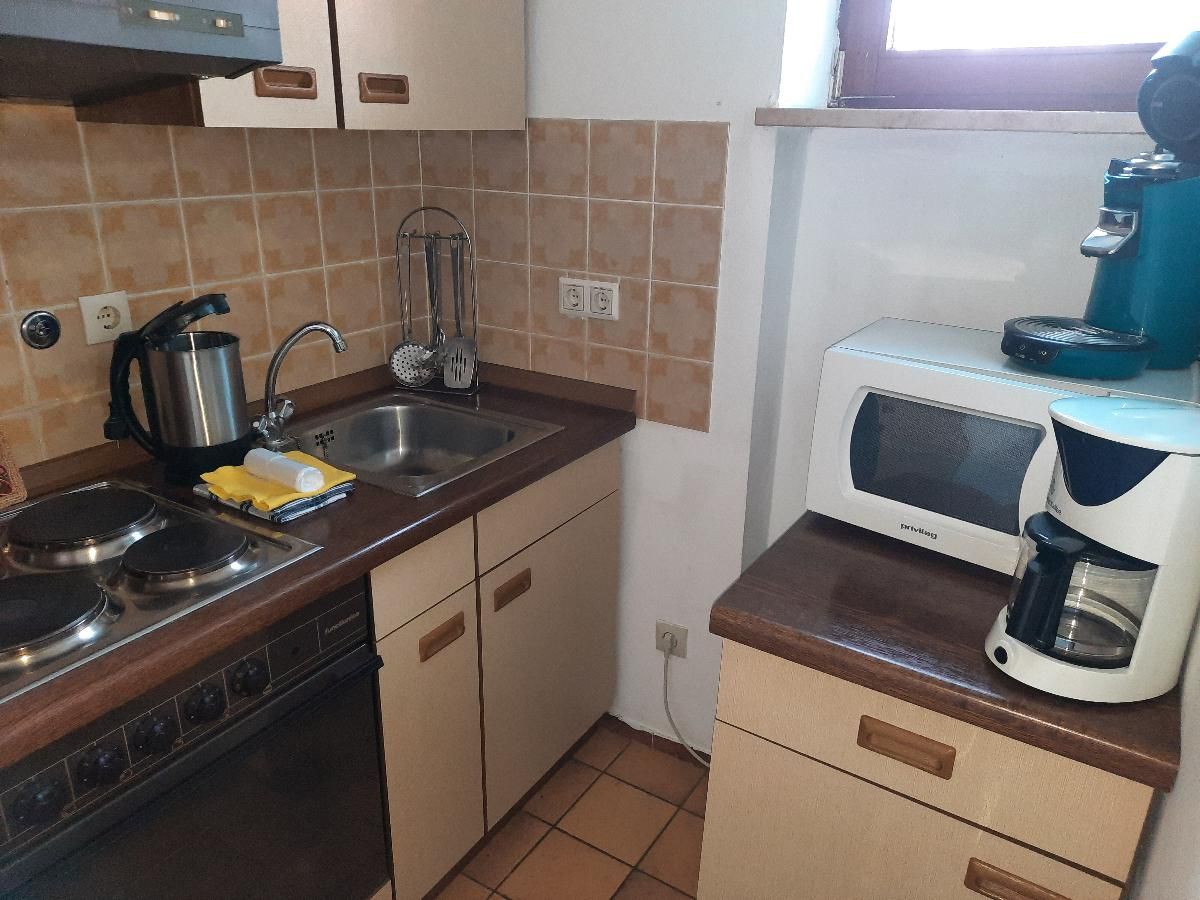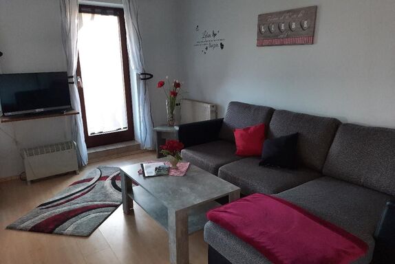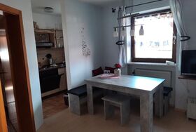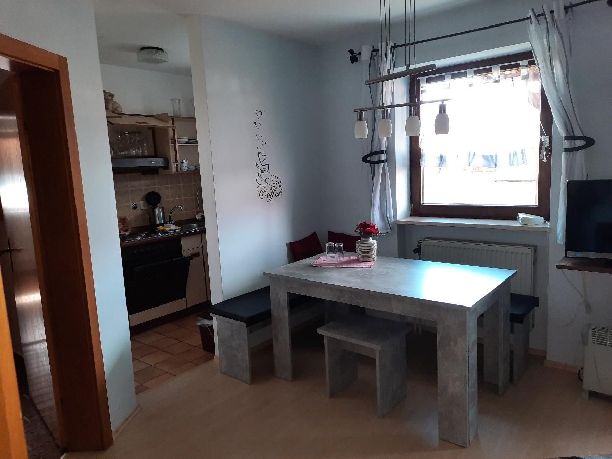 Die Ferienwohnung liegt in der untersten Etage und bietet auf 45 Quadratmetern Platz für bis zu 4 Personen. Der Wohn- und Essbereich ist ausgestattet mit einem Schwedenofen, einem Sat TV, einer Essecke und einem ausziehbaren Schlafsofa für zwei Personen. Die Küche ist mit Wasserkocher, Kühlschrank, Kaffeemaschine, Backofen, Geschirr und Geschirrtüchern voll ausgestattet. Im Badezimmer finden Sie eine Badewanne zum Entschleunigen. Das separate Schlafzimmer verfügt über ein Doppelbett und einen zweitürigen Spiegelschrank. Durch den Wohnbereich haben Sie Zugang zur Terrasse mit Gartenbestuhlung und können direkt von hier aus den Badeweiher sowie den Kinderspielplatz nutzen. Die Wohnung hat keinen Internetzugang