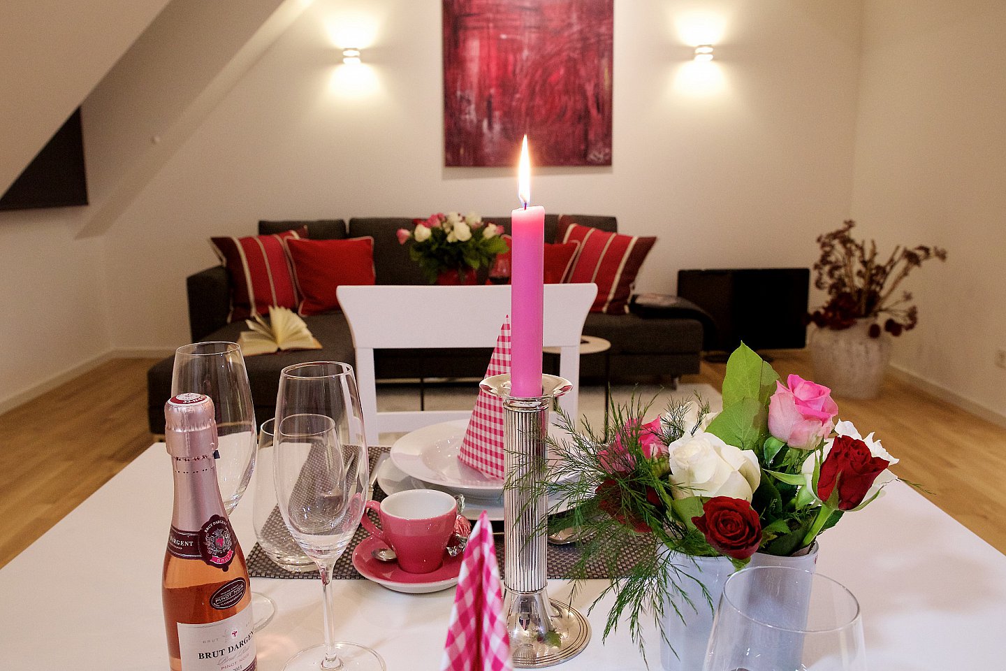 Wohn-/Eßzimmer mit einer gemütlichen Sitzecke und Couch (ausziehbar 160 x 200 cm)), 2 Decken zum einkuscheln, SAT-TV, Stereoanlage, Geschirr, Besteck und Gläser namhafter Hersteller, kostenfreier Internetzugang