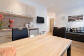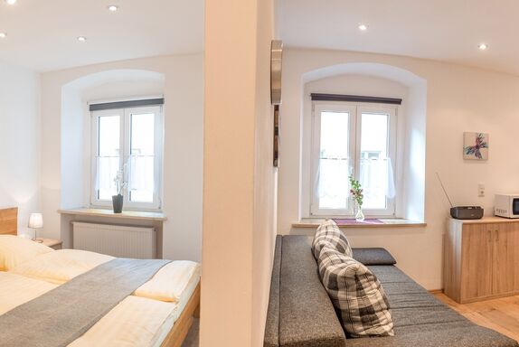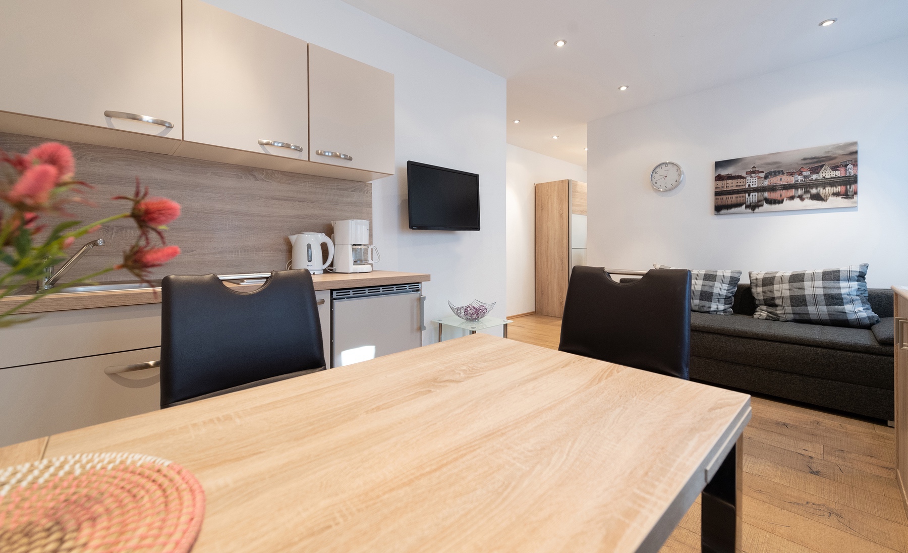 Das Einzimmerappartement mit einer Wohnfläche von ca. 30qm eignet sich für 2-3 Personen. Vom Eingang im ersten Stock gelangen Sie in einen kleinen Flur mit Garderobe. Durch die rechte Tür kommen Sie in einen modern eingerichteten Wohnraum mit Einbauküche, Esszimmertisch, Flachbild-TV und einer ausziehbaren Couch. Die moderne Küche bietet alles, was man zum Kochen und Essen braucht: Koch- und Essgeschirr, Kaffeemaschine, Kühlschrank, Herd, Wasserkocher und Toaster. Davon abgetrennt ist der Schlafbereich mit einem Kleiderschrank und einem Doppelbett (180 cm). Im Flur befindet sich eine zweite Tür, die zum Sanitärbereich führt. Dieser ist ausgestattet mit einer Toilette, einer komfortablen Dusche, einem Waschbecken, Fön und einem Spiegelschrank. In der ganzen Wohnung gibt es kostenfreies WLAN. Der Garten steht zur gemeinschaftlichen Nutzung zur Verfügung. Garage (falls frei, kostenpflichtig) und abschließbarer Fahrradraum vorhanden. Eine gemeinschaftliche Waschmaschine steht zur Verfügung.