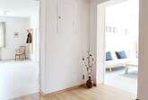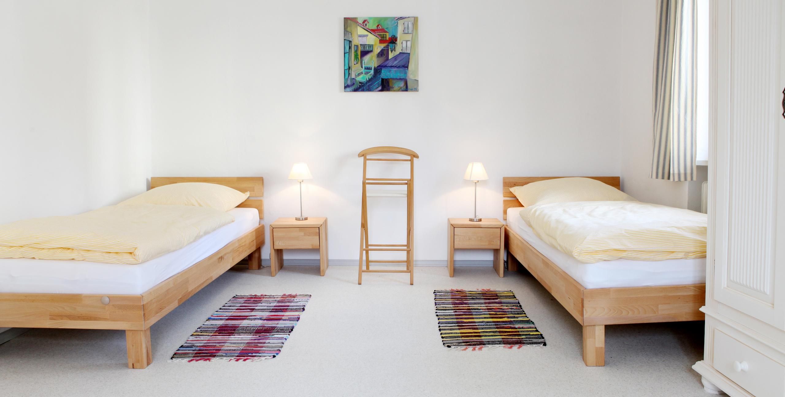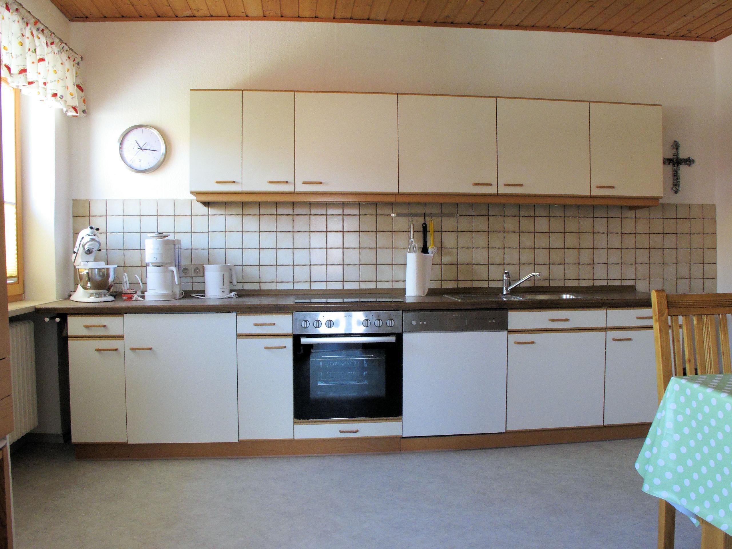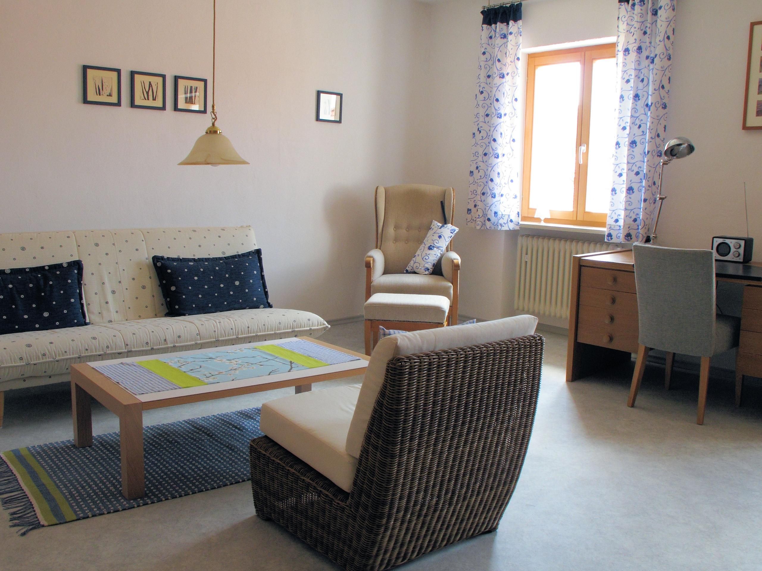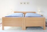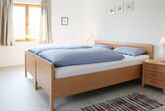 Die Ferienwohnung (110m²) befindet sich im 1. Stock und eignet sich für 5 Personen. Sie ist mit 2 Schlafzimmern ausgestattet, eines mit einem Doppelbett, eines mit drei Einzelbetten. Die Wohnküche verfügt über einen Essplatz, Spülmaschine, Kühlschrank, Herd, Backofen, Toaster, Kaffeemaschine, Mirkowelle, Wasserkocher, Ess- und Kochgeschirr.