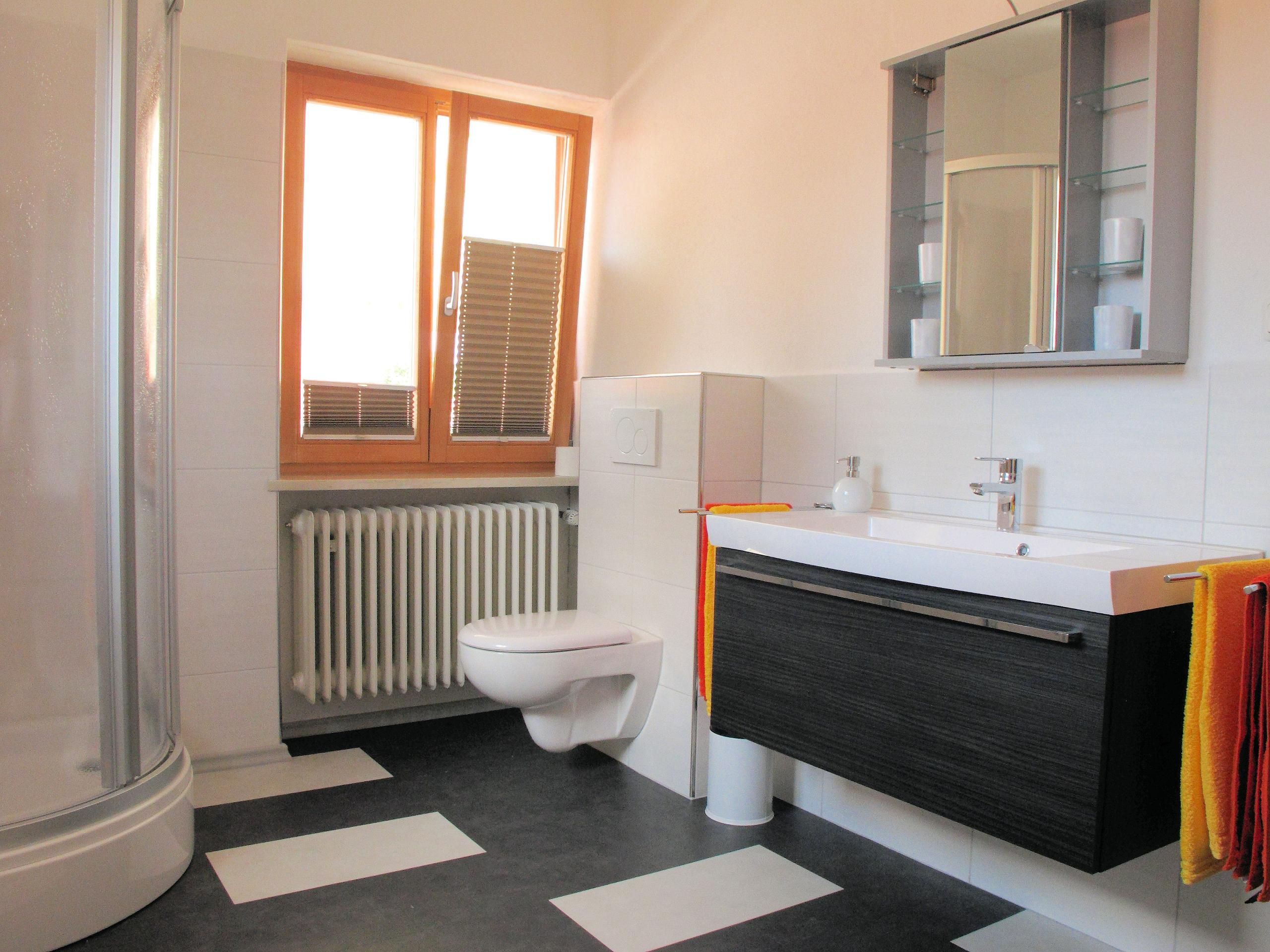 Radio. Das Badezimmer mit Dusche, WC, Fön und Handtücher rundet das Gesamtbild ab.