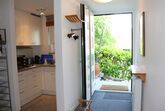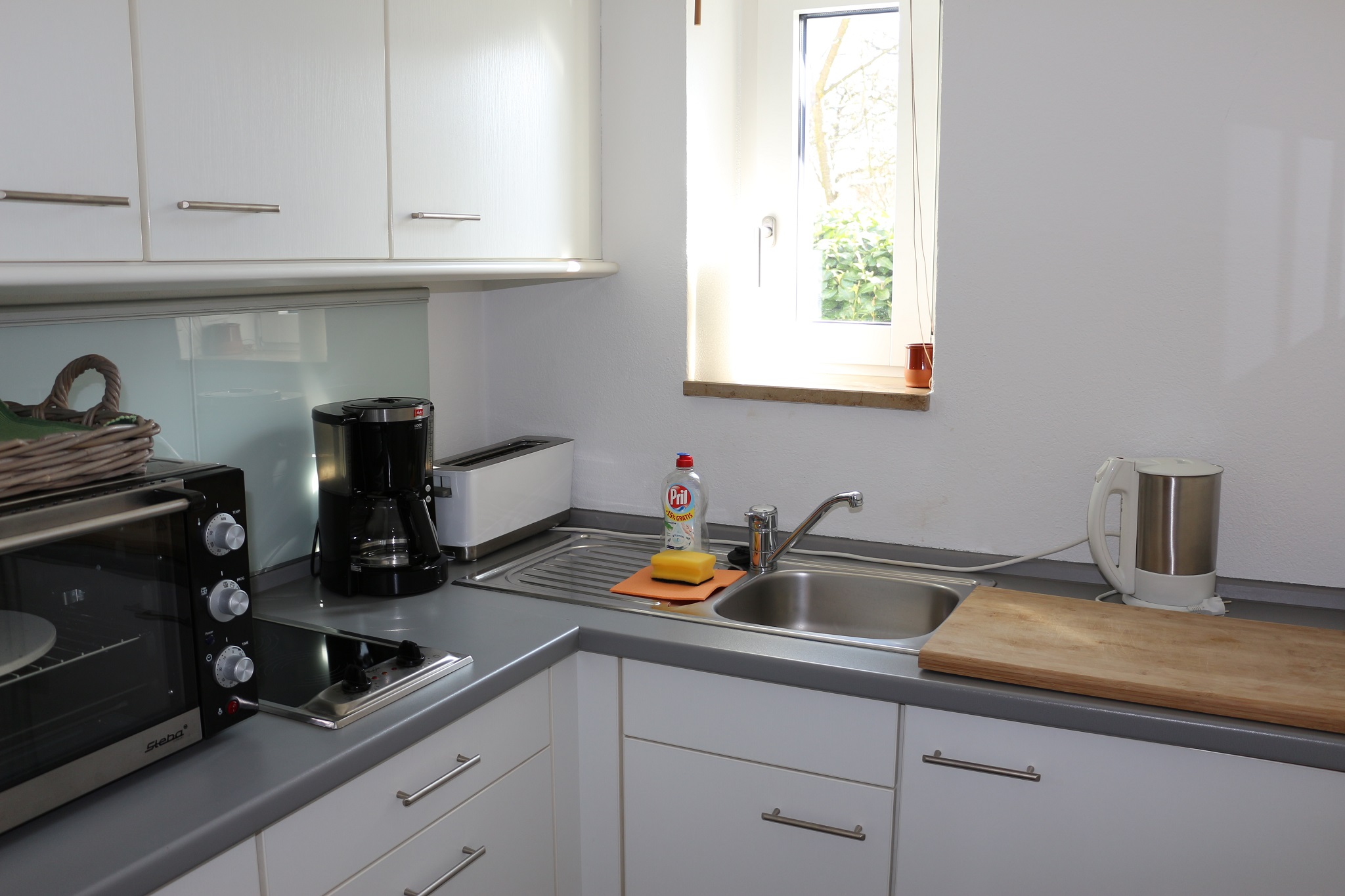 1 Einbauküche mit Kühlschrank und Gefrierfach, Cerankochfeld- 2 Platten, kleiner Backofen, Geschirr und Besteck, Filter-Kaffeemaschine und Nespresso Maschine, Wasserkocher, Töpfe und Toaster