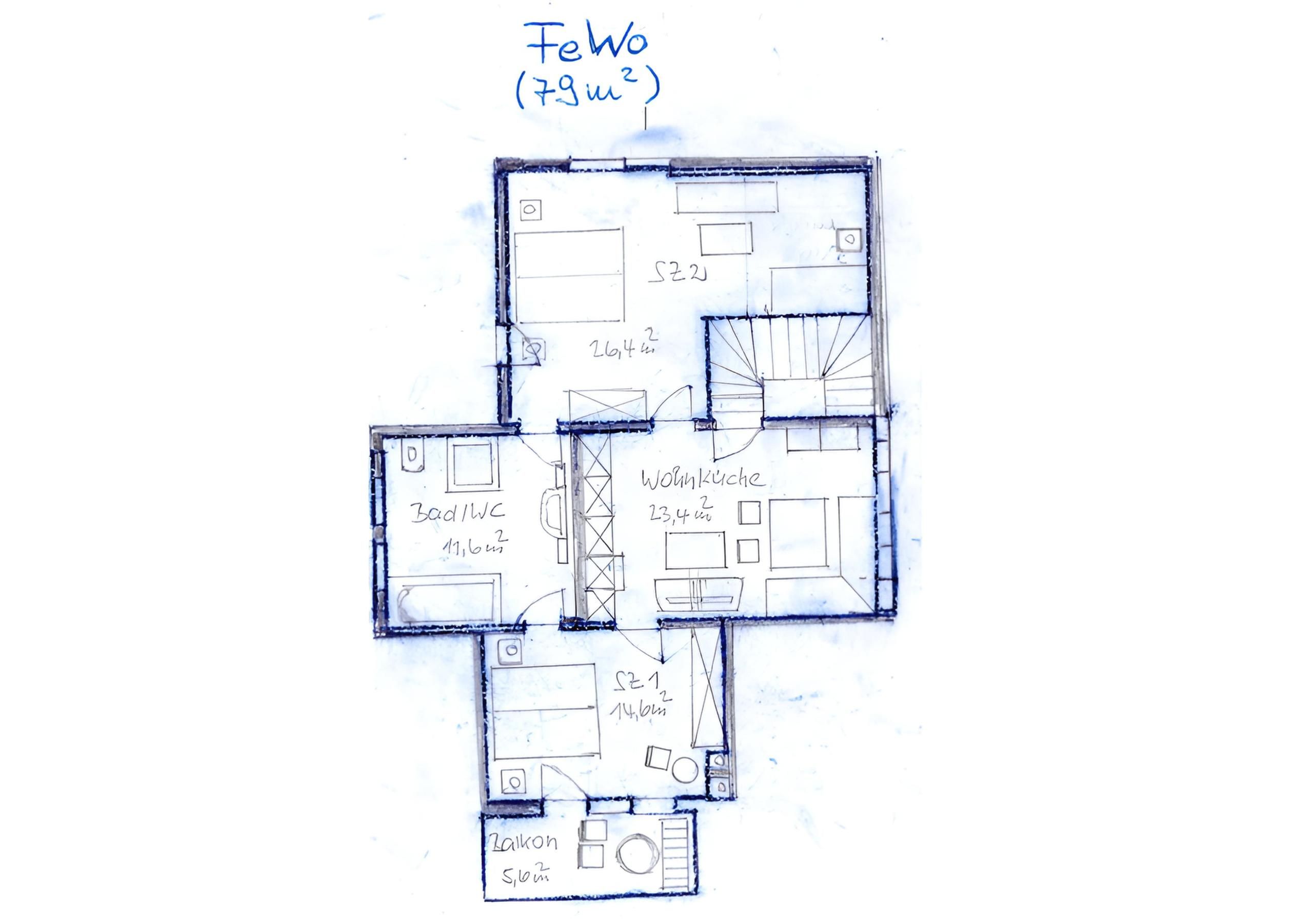 Bei Belegung mit 2 Personen wird nur das Schlafzimmer 1 zur Verfügung gestellt (Wohnfläche 54 m2).