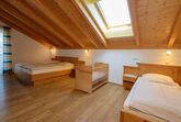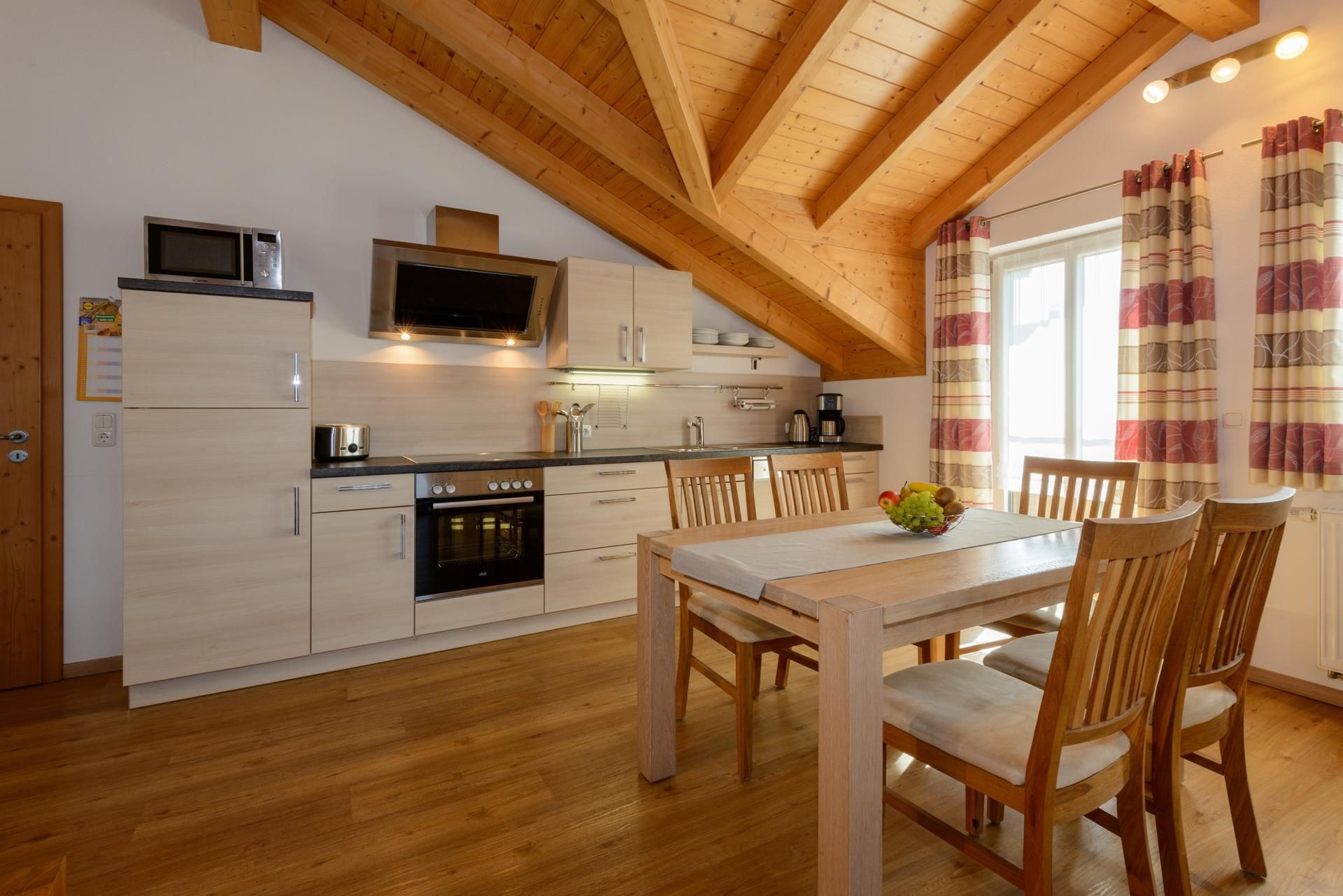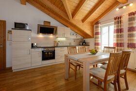 Unsere Ferienwohnung Almsonne mit 90 qm ist auf der 2. Etage und bietet Platz für 2 - 5 Personen. Der schöne Holzsichtdachstuhl in der ganzen Wohnung vermittelt Ihnen gleich ein Heimisches Gefühl von Natur. Der offengestaltete Wohn-Essbereich mit Sofa, Flachbild-TV, CD-Radio, Leselampe und Zugang zum Balkon lädt zum verweilen ein. Die komplett ausgestattete Küche mit Geschirrspüler, Kühlschrank incl. Gefrierfach, Herd, Backofen, Microwelle, Toaster, Wasserkocher, Kaffeefiltermaschine rundet den Essbereich ab. Die helle Ferienwohnung hat 2 Schlafzimmer, jeweils mit Doppelbett ohne Fußenden, einem Einzelbett, einem Babybett und Zugänge zu den Balkonen. Das geräumige Tageslichtbad ist mit ebenerdiger Dusche, Handtuchtrockner, Hocker, Wäscheständer und großen Spiegelschrank ausgestattet. Nach entspannten Grillabenden werden die Außenrollos der