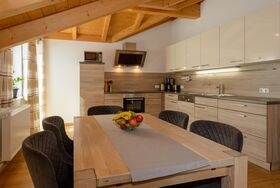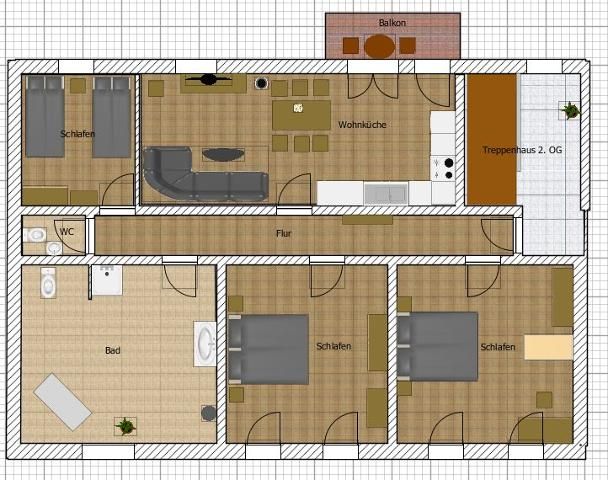 Die Ferienwohnung mit 120 qm bietet Platz für 2-6 Personen und befindet sich in der 2. Etage. Der Holzsichtdachstuhl in der ganzen Wohnung bietet Ihnen gleich ein Heimisches Gefühl von Natur. Der helle und großzügig gestaltete Wohn- Essbereich mit Sofa, Flachbild-TV, CD-Radio und Leselampe lädt zum entspannen ein. Die komplett ausgestattete Küche mit Geschirrspüler, Kühlschrank incl. Gefrierfach, Herd, Backofen, Microwelle, Toaster, Wasserkocher, Kaffeefiltermaschine und Zugang zum Balkon lässt keine Wünsche offen. Die 3 Schlafzimmer verfügen über 2 Doppelbetten ohne Fußenden, 2 Einzelbetten, einem Babybett und einem Schreibtisch mit Tischleuchte. Die Ferienwohnung hat ein Badezimmer mit Fenster, ebenerdiger Dusche, Handtuchtrockner, Hocker, Wäscheständer und großen Spiegelschrank, sowie ein seperates WC. Nach entspannten Grillabenden werden die Außenrollos der