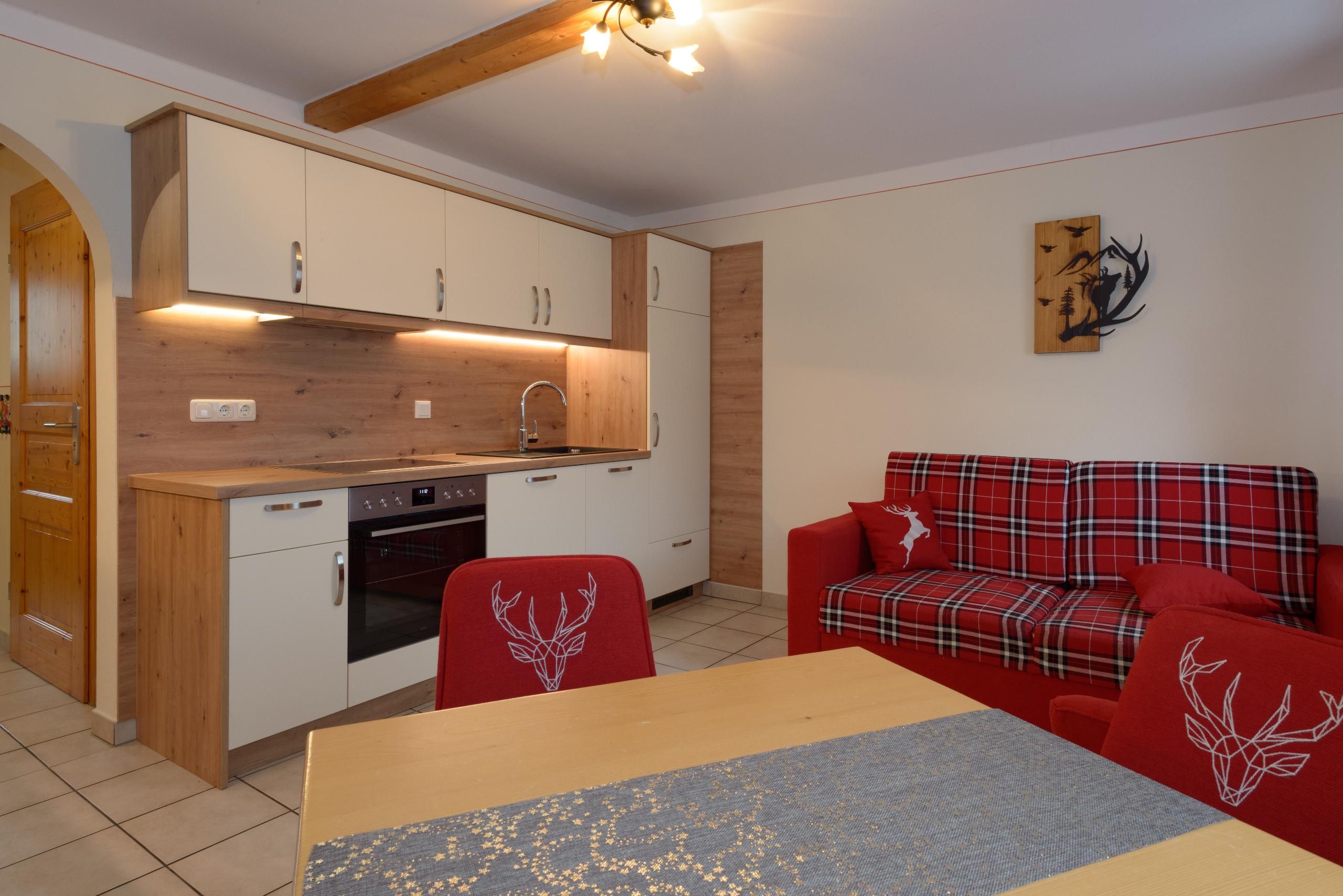 Die gemütliche Wohnküche ist mit Backofen, Spülmaschine, Mikrowelle, Gefrierschrank, Kaffeevollautomat, Wasserkocher, Toaster usw. ausgestattet. So können Sie sich auch im Urlaub ohne Einschränkungen selber versorgen. Auch eine Babyausstattung, wie Hochstuhl und Flaschenwärmer, können wir Ihnen zur Verfügung stellen.
