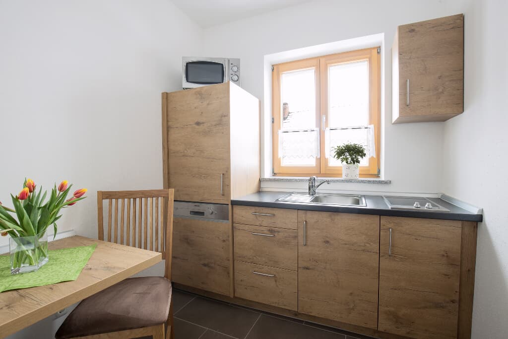 Die Ferienwohnung ist mit Kühlschrank (ohne Gefrierfach), Herd mit vier Kochfelder, Backofen, Kaffeemaschine und Wasserkocher ausgestattet. Eine Grundausstattung an Küchenutensilien wie Geschirr, Besteck, Töpfe usw. ist vorhanden. Ausserdem Sat-TV und WLAN kostenlos.