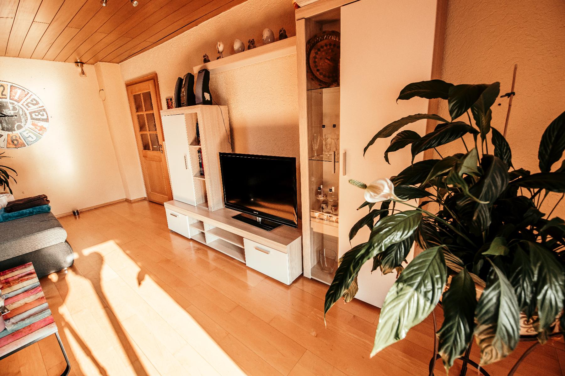 gemütliche Wohnzimmer mit bequemen Sofa und Flachbild-TV lädt zum