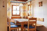 Erker steht ein rustikaler Esstisch mit Eckbank. Die Wohnung verfügt über eine
