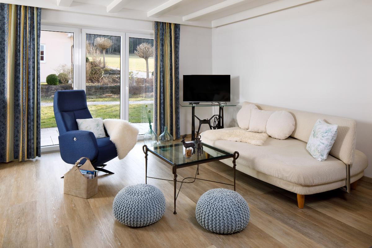 • Ein großes Design – Sofa, ein Relax Sessel in hervorragender Sitzqualität und zwei Hocker schaffen Ihnen Entspannung vorm Kamin und einen herrlichen Blick auf die Hügel und Wälder unserer Gegend.
