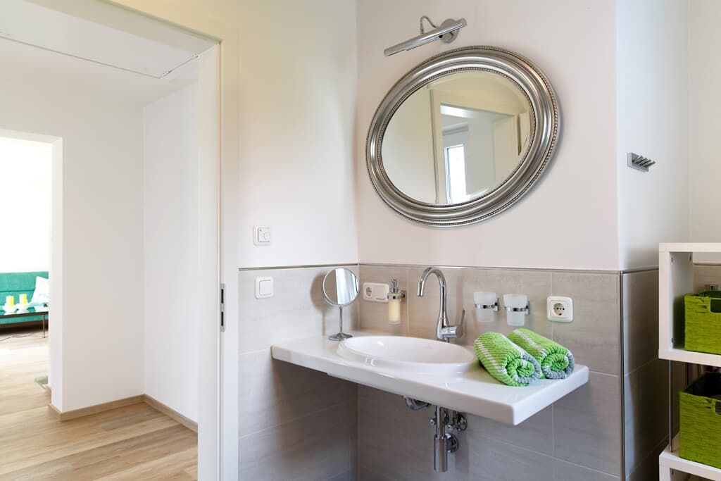 • Waschbecken, WC und Dusche (behindertengerecht nach DIN), Schrankregal, Wäschestnder, Föhn