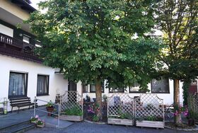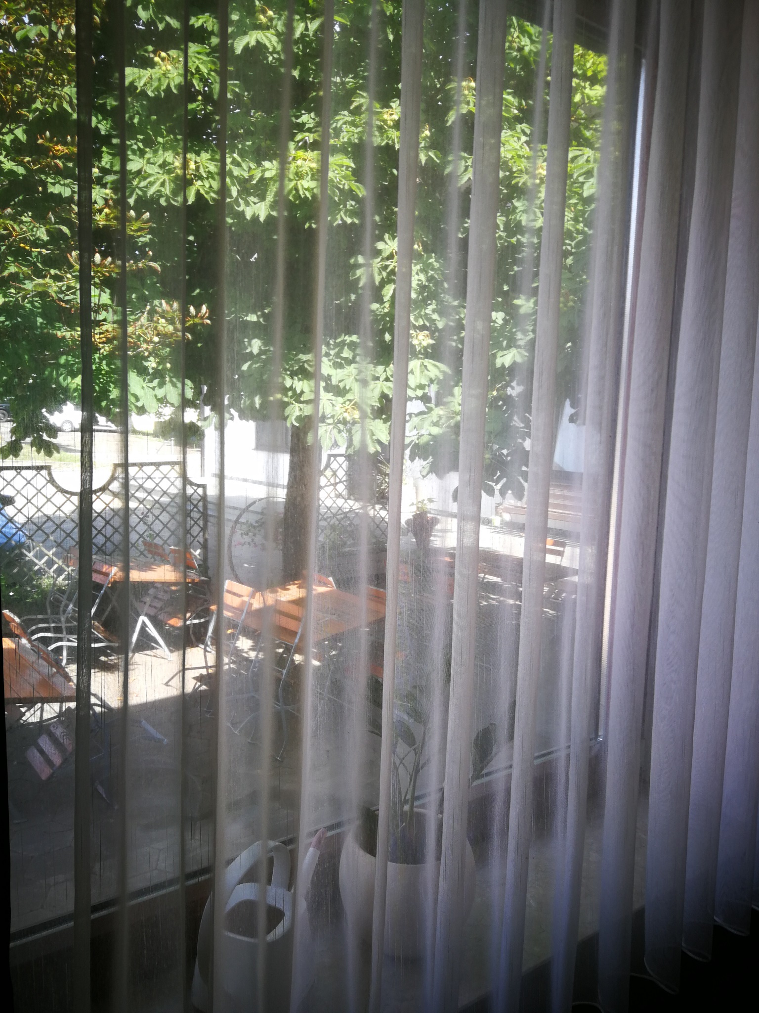 Draussen können sie unter Kastanienbäumen in unserem Gästegarten Platz nehmen. Dieser ist über den Hauseingang erreichbar.. Morgens im Schatten und abends in der Sonne.