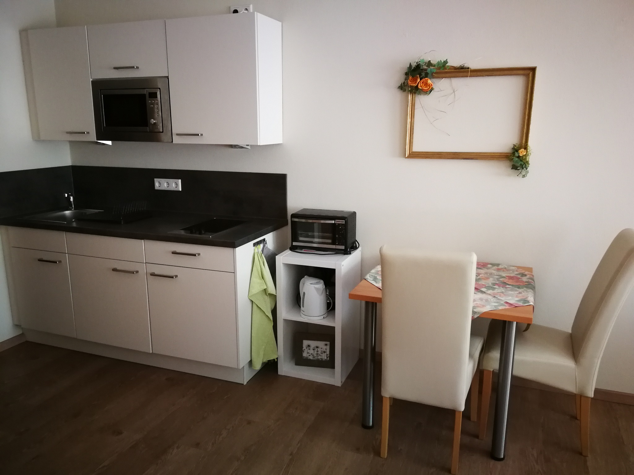 Es steht Ihnen eine gut ausgestattete Küchenzeile mit 2er Ceranfeld, Spüle, Mikrowelle, Kaffeemaschine,Wasserkocher, und Kühlschrank zur Verfügung. Ein Esstisch,zwei Stühle und eine Leseecke sind vorhanden. Das Doppelbett ist als Einzelbetten nutzbar. Bitte bei Buchung angeben wie sie es wünschen. Das Badezimmer ist mit Dusche und WC eingerichtet.