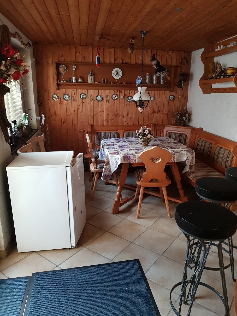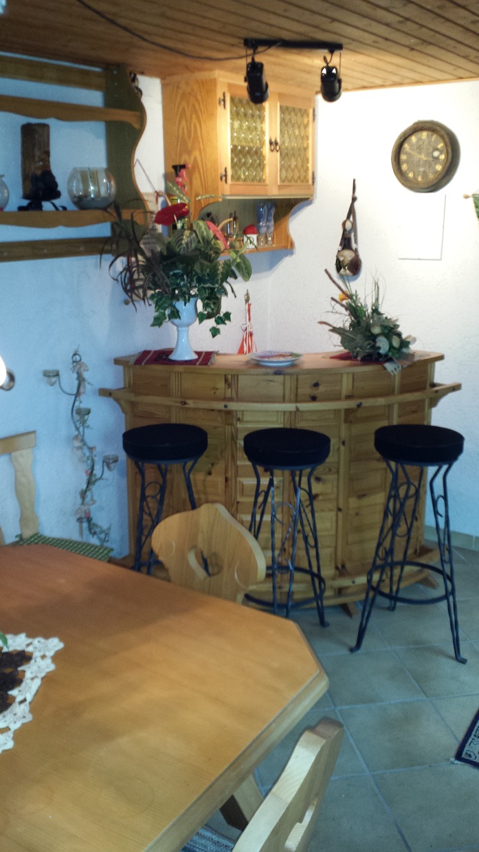 Vor dem Eingang im Hof befindet sich eine Sitzecke mit Gartenmöbeln, ebenso kann die große Terrasse zur Gartenseite mitbenützt werden. Beide laden abends zum Grillen und gemütlichen Beisamensitzen ein, bei Regen in unserer kleinen Bar mit Theke und Eckbank.