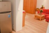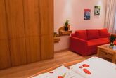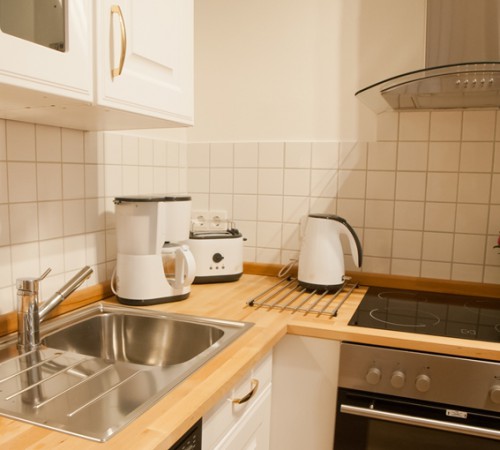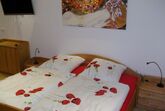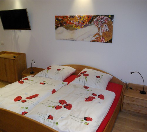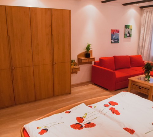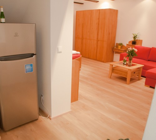 Ein Raum mit Doppelbett (200 x 200 cm), Kleiderschrank, Kommode und Couch in L-form und LCD – Fernseher mit Sat-Anschluss. Separater Essplatz – Essgruppe bestehend aus einem massiven Buche-Tisch mit 4 Designer Stühlen. Küche mit Dunstabzug, Kühlschrank, Ceran-Kochfeld, Backofen, Mikrowelle, Geschirrspüler, Kaffeemaschine, Toaster und Wasserkocher. Kochgeschirr, Service, Gläser und Besteck sind vorhanden.