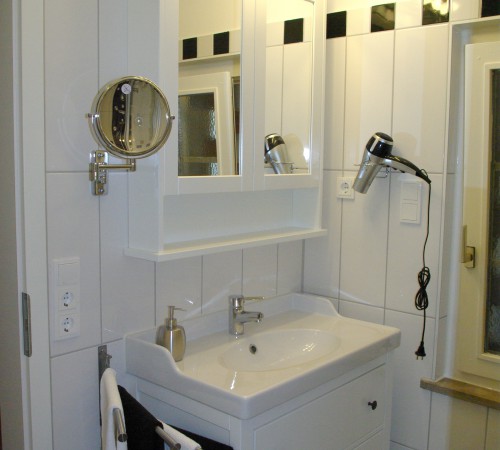 Bad mit schwarzen und weißen Wand- und Bodenfliesen, Fußbodenheizung, Dusche, Fön, Kosmetikspiegel, Spiegelschrank mit Unterschrank und Waschmaschine.