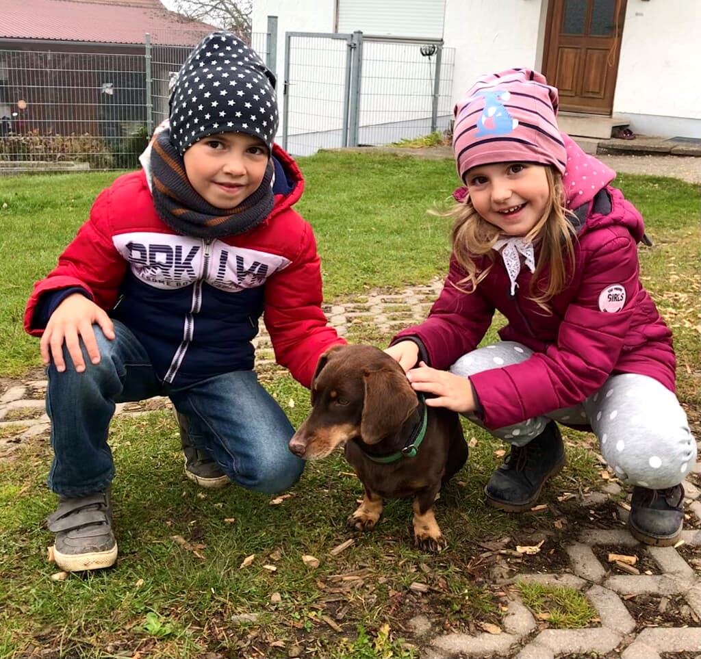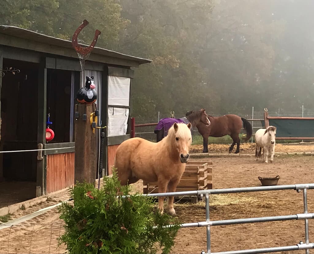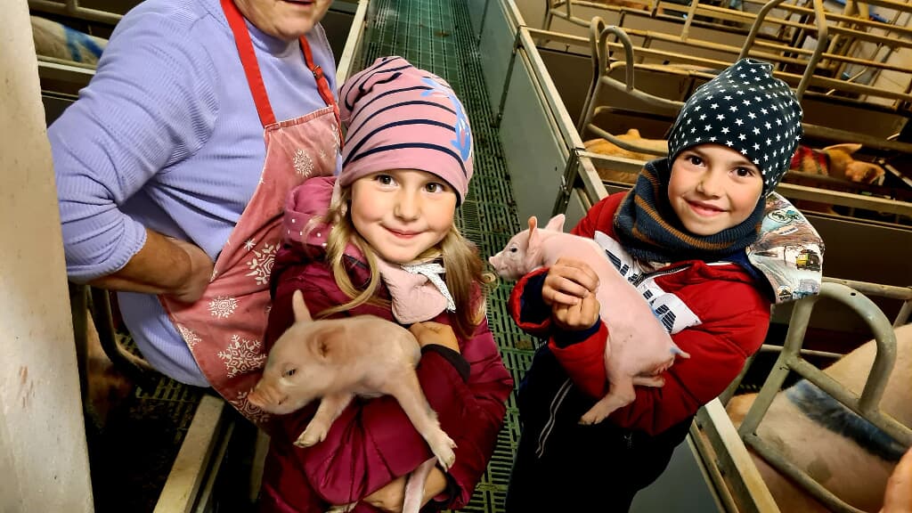 Tiere am Hof: Pony, Hund, Katzen, Ferkel.