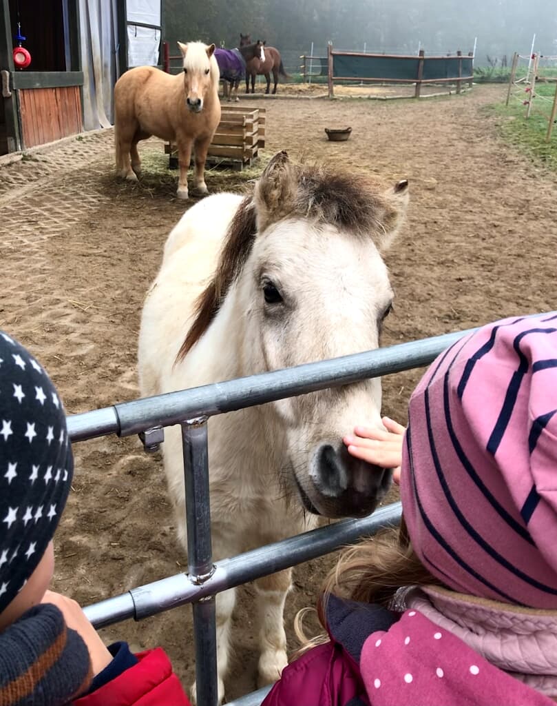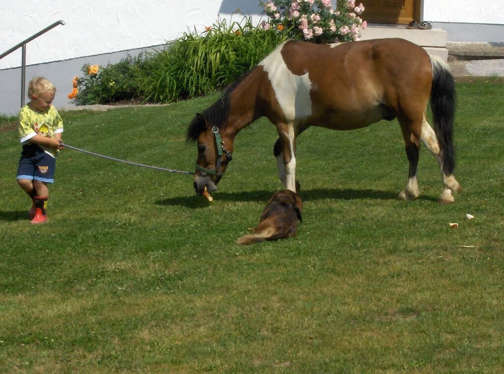 Tiere am Hof: Pony, Hund, Katzen, Ferkel.
