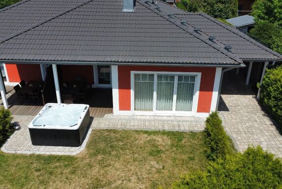 Zwei Bungalows nebeneinander, hier der große Winkelbungalow, genannt: Murnerseehaus ist unterteilt in großes und kleines Appartement mit zwei Hauseingängen. Die gute Raumaufteilung ermöglicht dennoch für 5 Personen Platz: 5 Betten und eine zusätzliche Schlafmöglichkeit im WZ (auf Anfrage).Der Whirlpool vor der Terasse kann gegen einen Aufpreis dazugebucht werden.