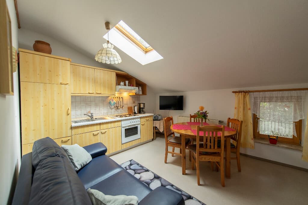 Schlafzimmer mit Doppelbett und geräumigem Schrank, Wohnschlafraum mit Küchenzeile (ausgestattet mit Kaffeemaschine, Toaster und Mixer), TV, WLAN-Gastzugang, ausziehbarem Sofa und optionalem Gästebett, Föhn vorhanden.