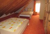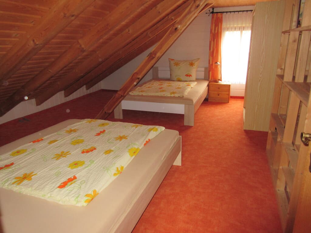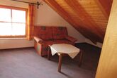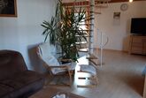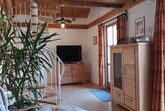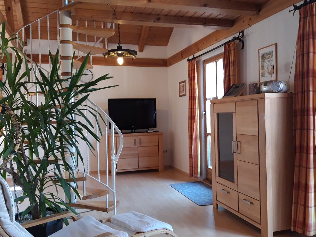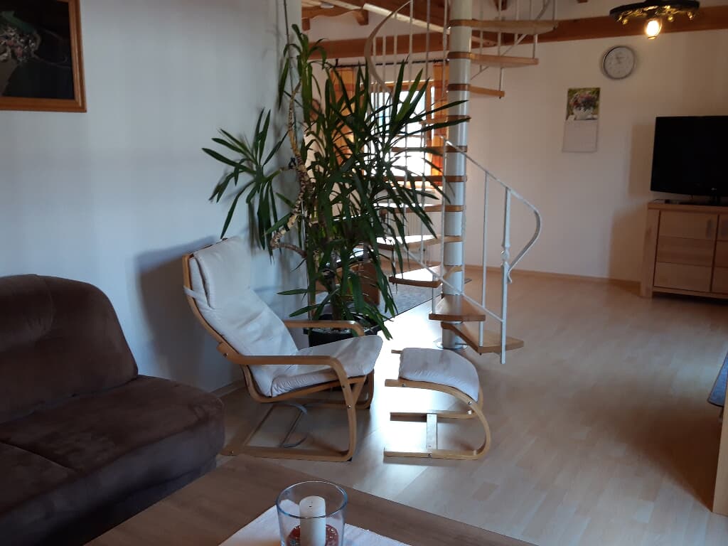 Ebenfalls im Erdgeschoss befindet sich das geräumige Wohnzimmer mit großem Flat-TV. Über die Wendeltreppe im Wohnraum gelangen Sie in das Dachgeschoss. Dort befindet sich eine Galerie mit ausziehbarer Schlafcouch und ein weiterer Schlafraum mit zwei Einzelbetten (je 1,40 x 2,00 m). Auf Anfrage kann gerne ein Kinderbett zur Verfügung gestellt werden.
