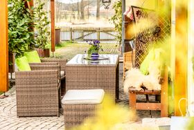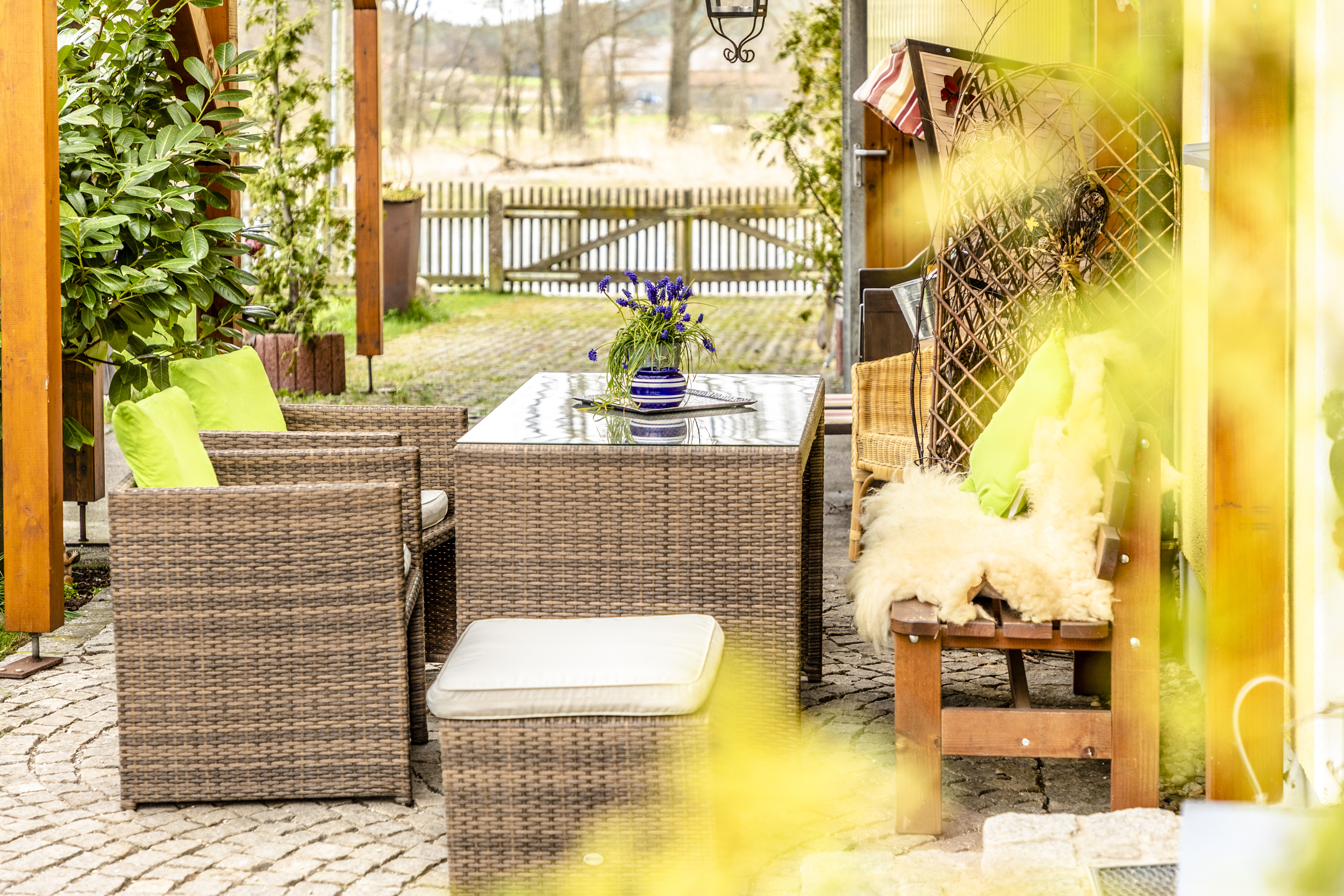 Die Ferienwohnung Morgenrot ist eine 50qm große FeWo im Erdgeschoss, mit eigenen Eingang, Sitzgruppe und Liegewiese zur alleinigen Nutzung.