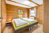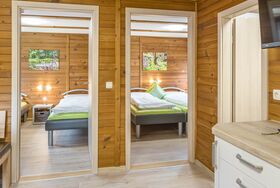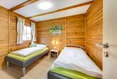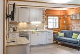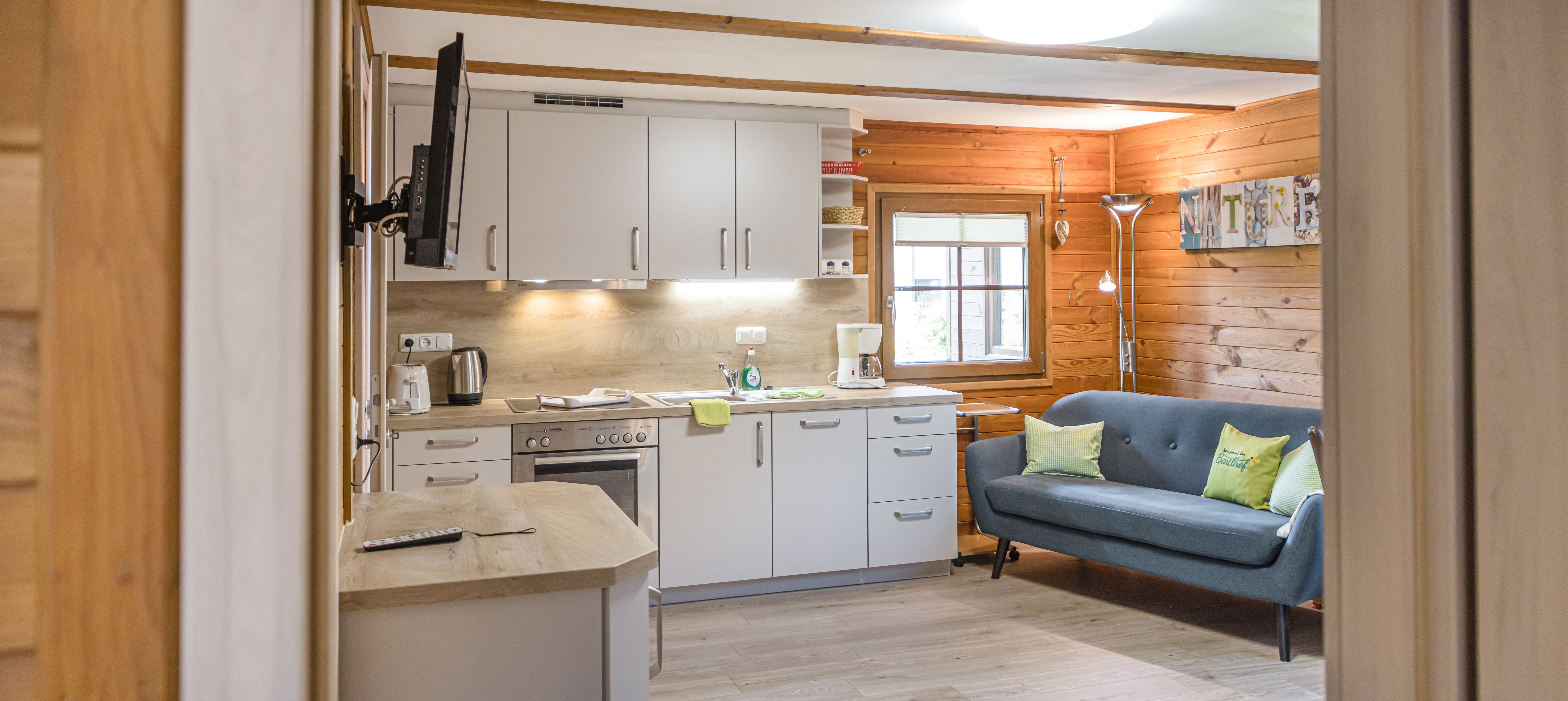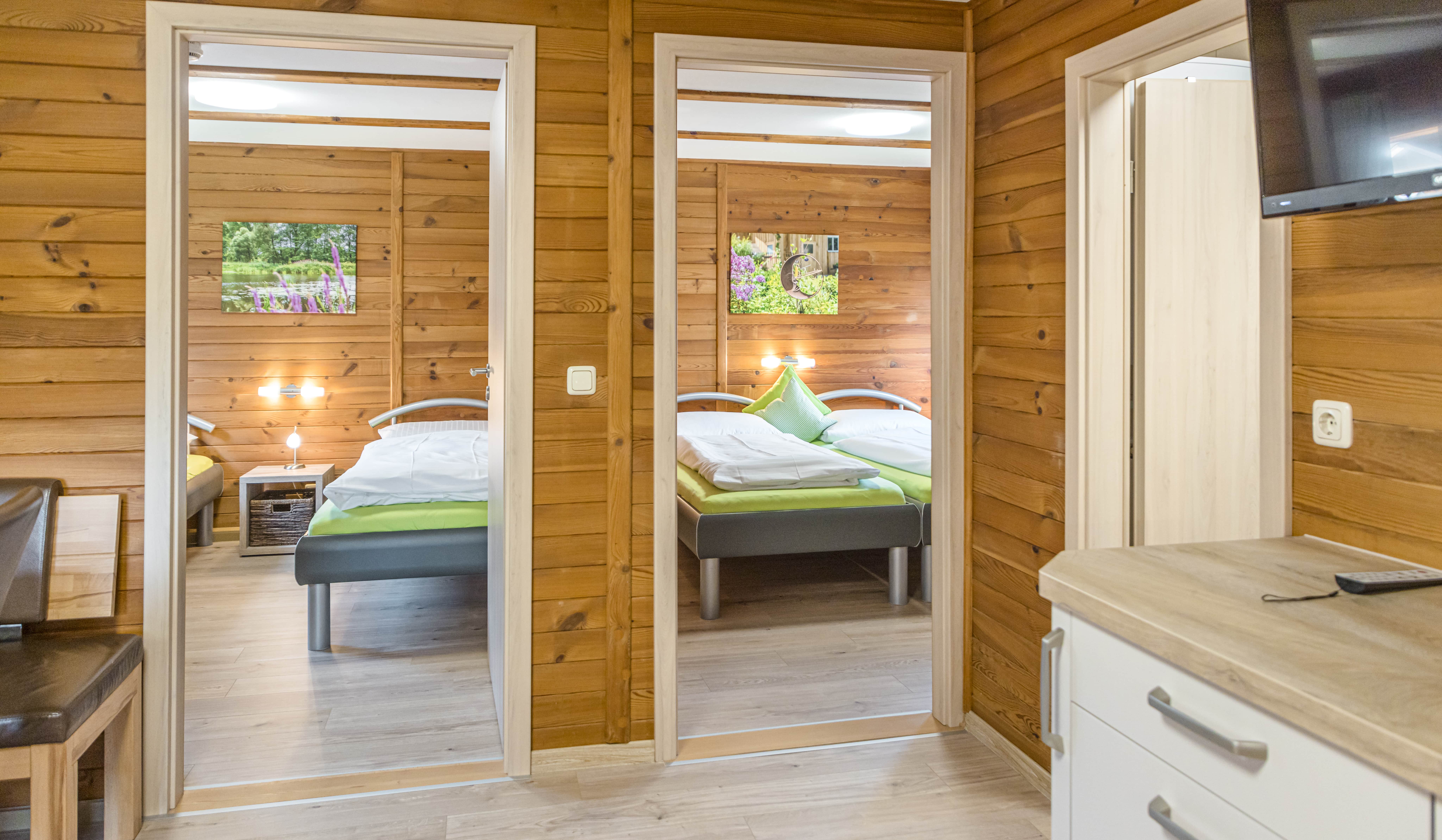 Das Blockhaus hat 2 Schlafzimmern, jeweils mit zwei trennbaren Betten. In der Wohnküche finden Sie einen Kühlschrank, einen Backofen, ein Cerankochfeld, eine Mikrowelle, eine Kaffeemaschine, eine Toaster und einen Wasserkocher. Die Couch lädt zum gemütlichen Fernsehabend ein. Das Bad ist mit einer Dusche und einem WC ausgestattet.