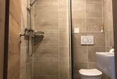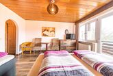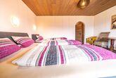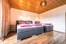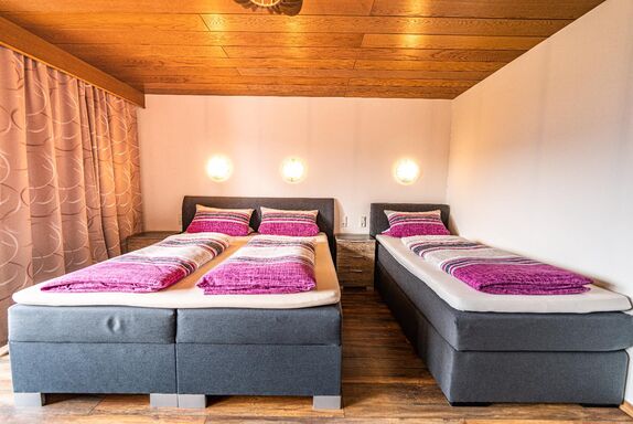 Lichtdurchflutetes Dreibettzimmer mit Holzboden und gemütlichen Komfort Boxspringbetten (180 cm x 200 cm, 100 cm x 200 cm). Westbalkon mit Blick auf die schönen bayrischen Berge. Helles Badezimmer mit begehbarer Dusche und WC.