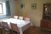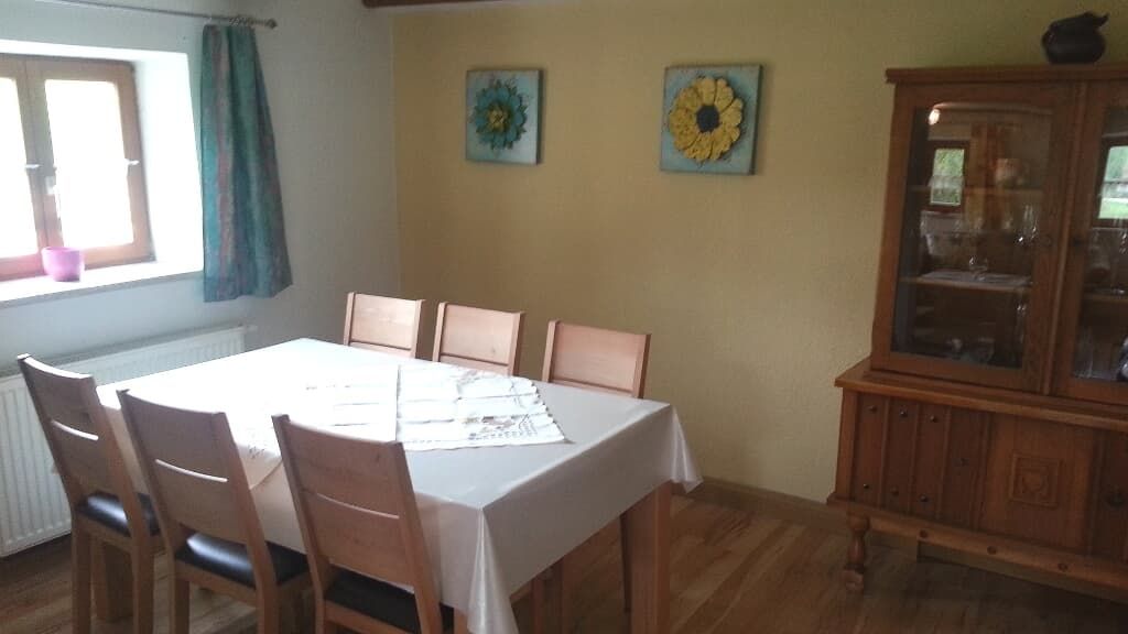 Ferienhaus (100 qm) für 2 bis 5 Personen: Im Erdgeschoss befindet sich das Wohnzimmer mit Couchgarnitur, Kaminofen und Sat-TV, ein Eßzimmer mit Tisch und 6 Stühlen, eine Küche mit Spülmaschine, Ceranfeld, Backofen, Wasserkocher und Kaffeemaschine, ein Badezimmer mit Dusche und Wanne, sowie ein separates WC. Im Obergeschoss sind 2 Schlafzimmer, einmal mit einem Doppelbett und einem Einzelbett und das zweite Schlafzimmer sind zwei getrennte Betten. Zusätzlich eine Schlafmöglicheit im Vorraum falls nötig .Waschmaschine auf Anfrage. Vor dem Haus befindet sich eine Liegewiese, eine Terasse mit Gartenmöbeln und Grill. Auto-Stellplätze befinden sich direkt am Ferienhaus! Die Betten sind bereits bezogen!
