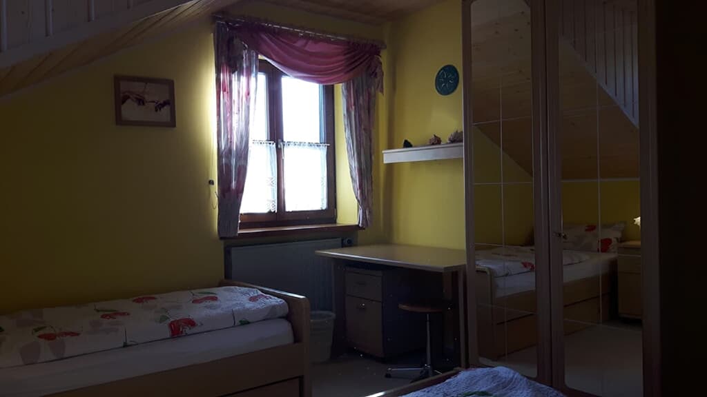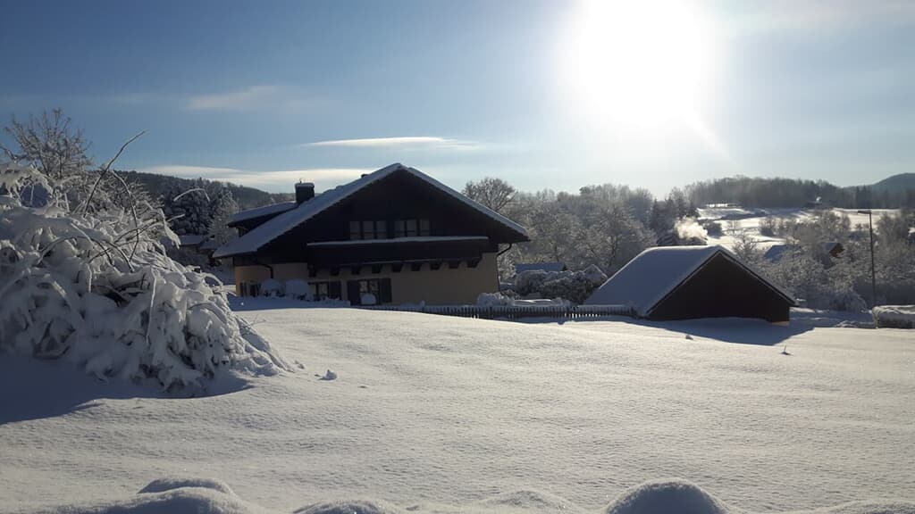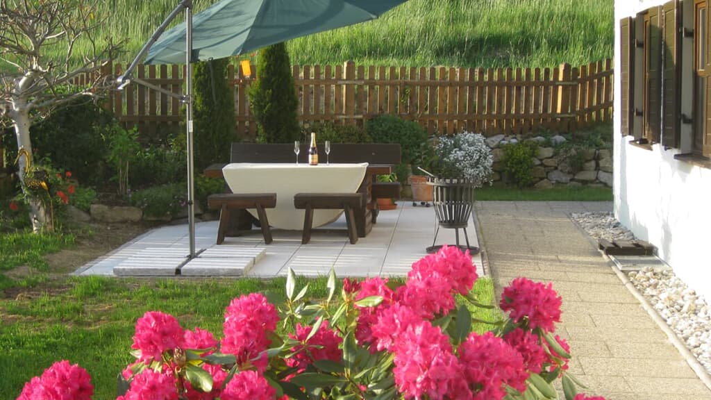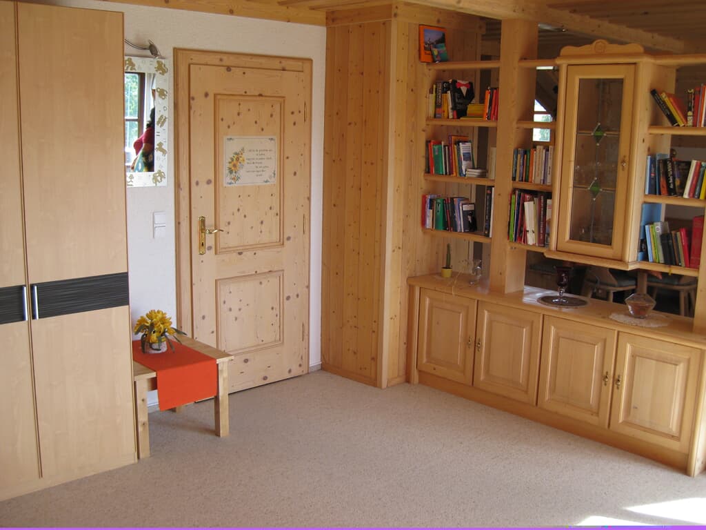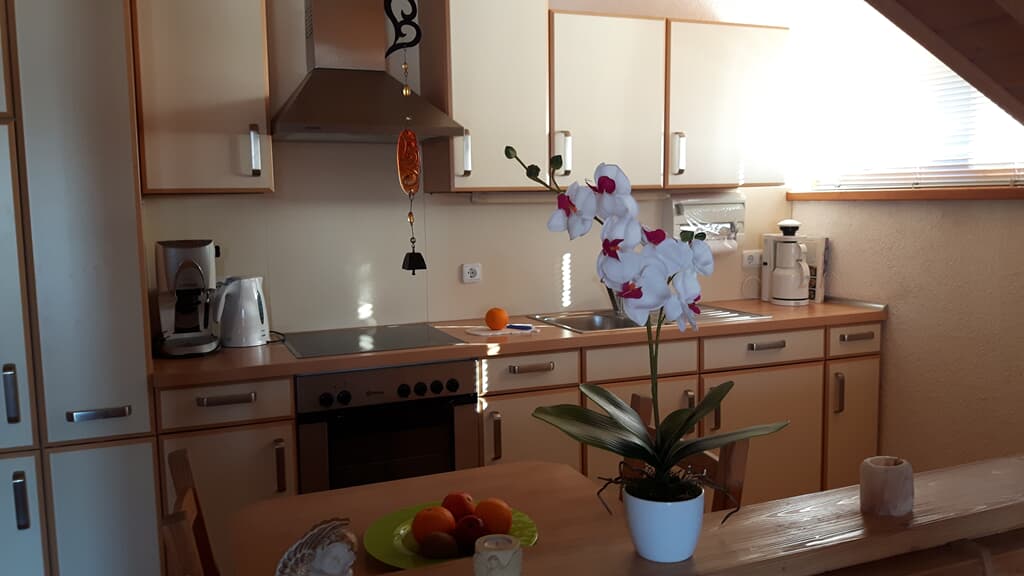 Ausstattung der Ferienwohnung: Gemütliche Küchenzeile mit Essecke. Elektroherd mit Backofen, Kühlschrank mit Gefrierfach, Kaffeemaschine, Tassimo-Espressomaschine, Waffeleisen, Toaster, Wasserkocher, Geschirr, Eierkocher. Ein kombinierter Wohn- und Schlafraum mit Vollholzraumteiler, Kabel-TV, Telefon, DSL-WLan-LAN-Internetzugang, DVD-Player, Stereoanlage, Radiowecker. Badezimmer mit großer Badewanne und Fenster, zugleich auch Dusche, WC, Fön. Großer Balkon in Südwestlage mit freier Aussicht. Alle Räume sind mit einem Hausgang und Garderobe verbunden. Großer Garten mit zwei Terassen, Liegewiese und Grillmöglichkeit.